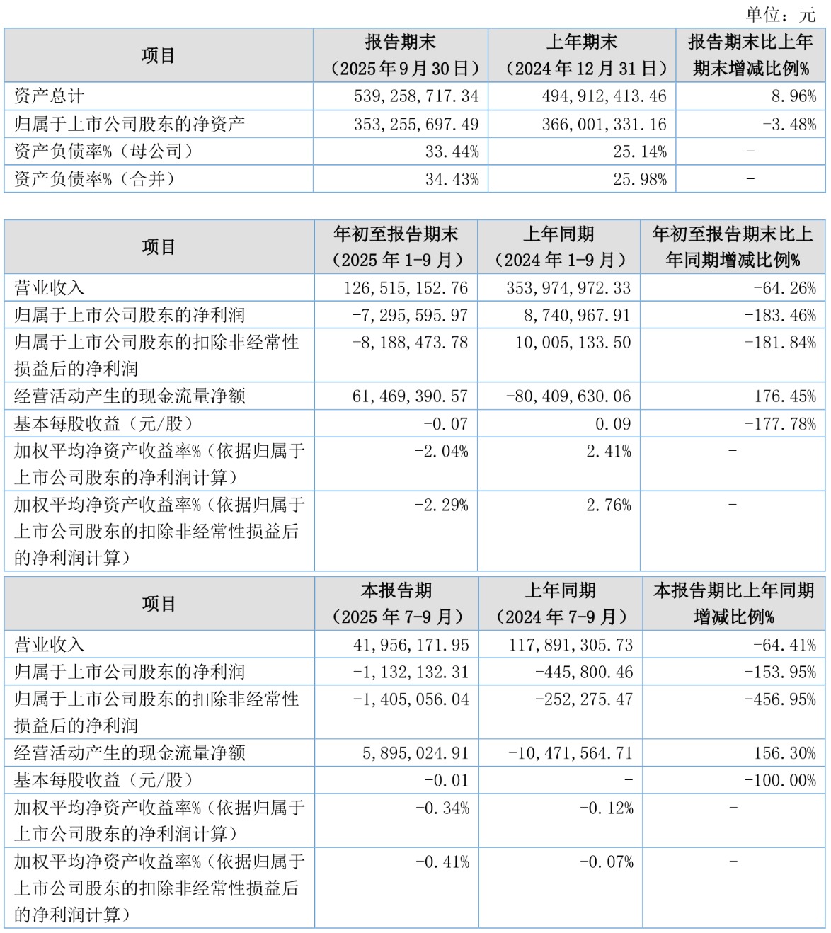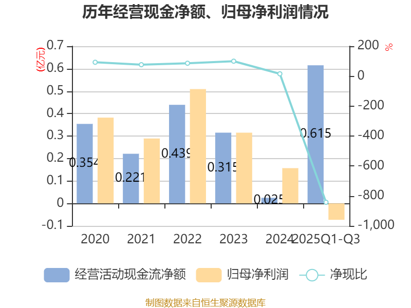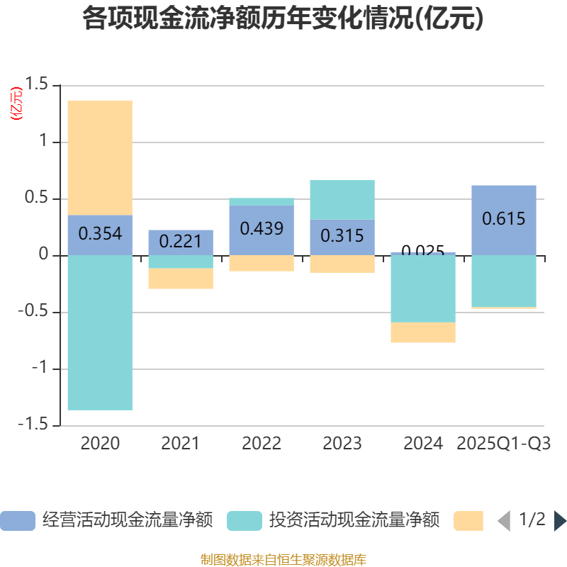 2025年前三季度,公司经营活动现金流净额为6146.94万元,同比增加1.42亿元;筹资活动现金流净额-132.65万元,同比减少2137万元;投资活动现金流净额-4590.16万元,上年同期为-3675.74万元。