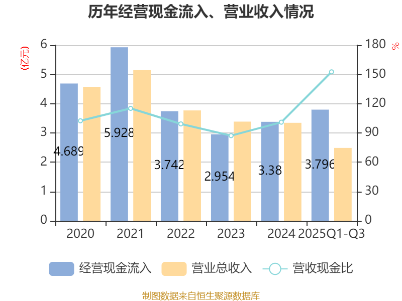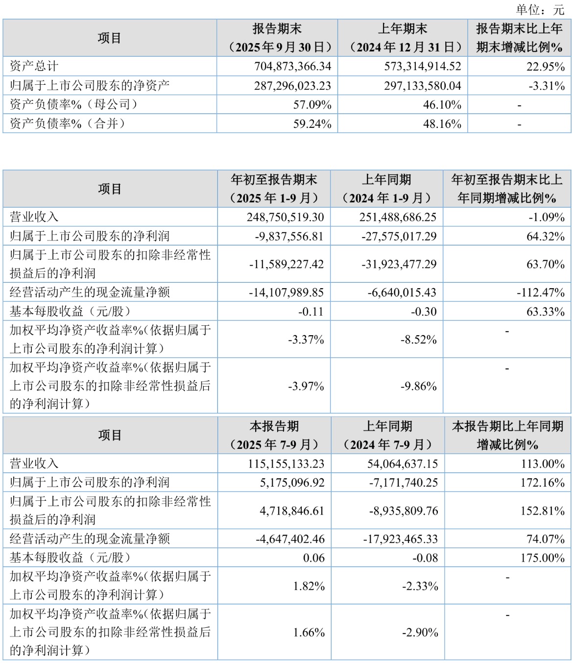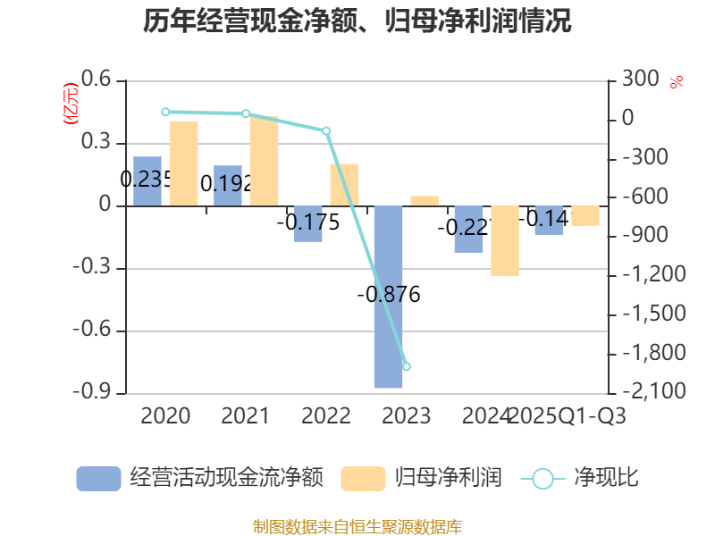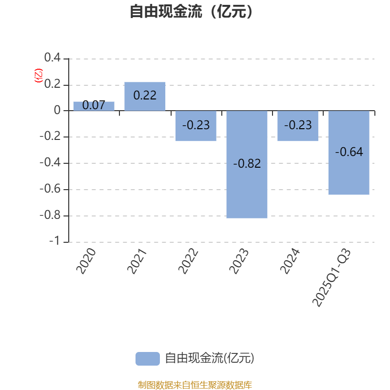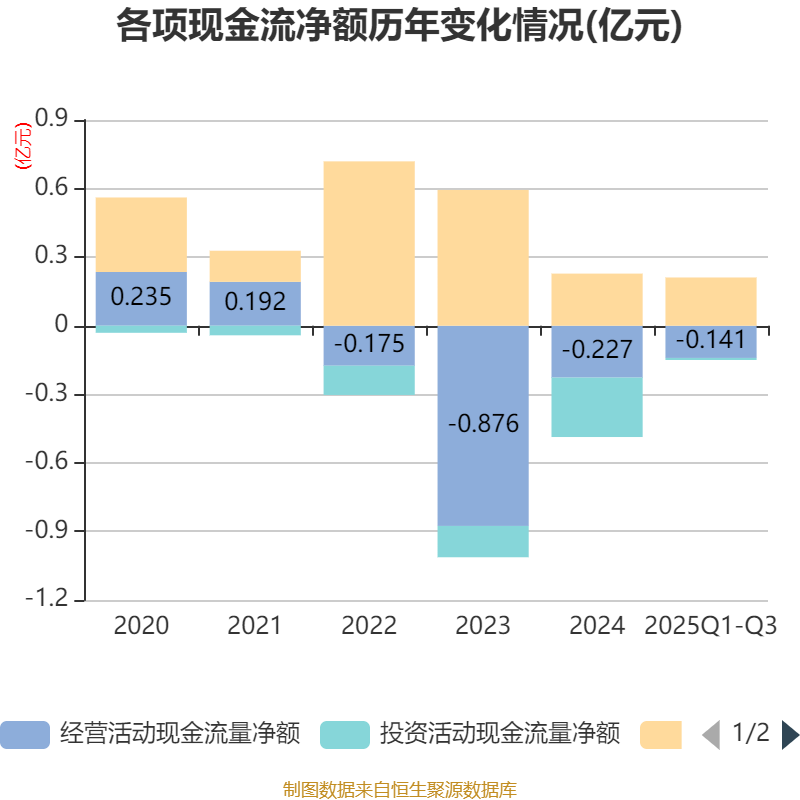 2025年前三季度,公司经营活动现金流净额为-1410.8万元,同比减少746.8万元;筹资活动现金流净额2112.83万元,同比增加4507.06万元;投资活动现金流净额-90.7万元,上年同期为-1169.29万元。