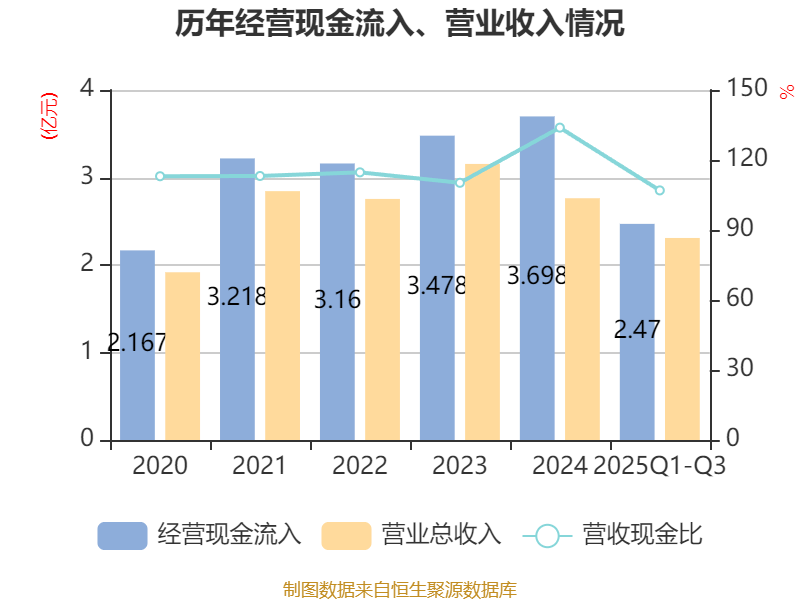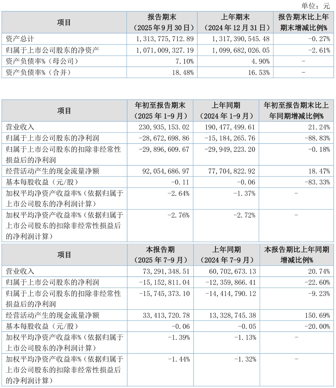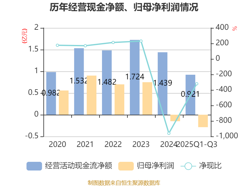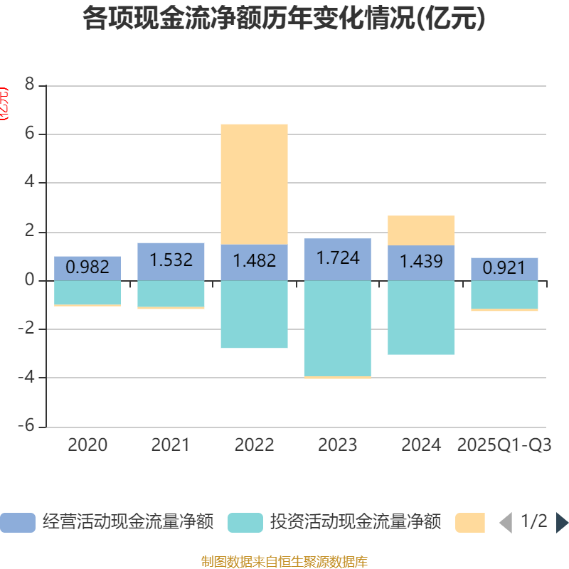 2025年前三季度,公司经营活动现金流净额为9205.47万元,同比增长18.47%;筹资活动现金流净额-908.6万元,同比减少18.66万元;投资活动现金流净额-1.16亿元,上年同期为-1.58亿元。