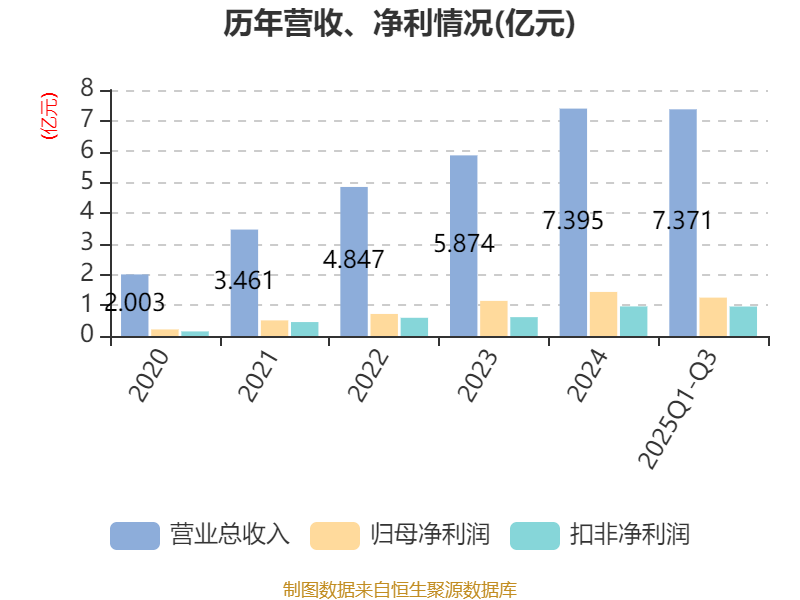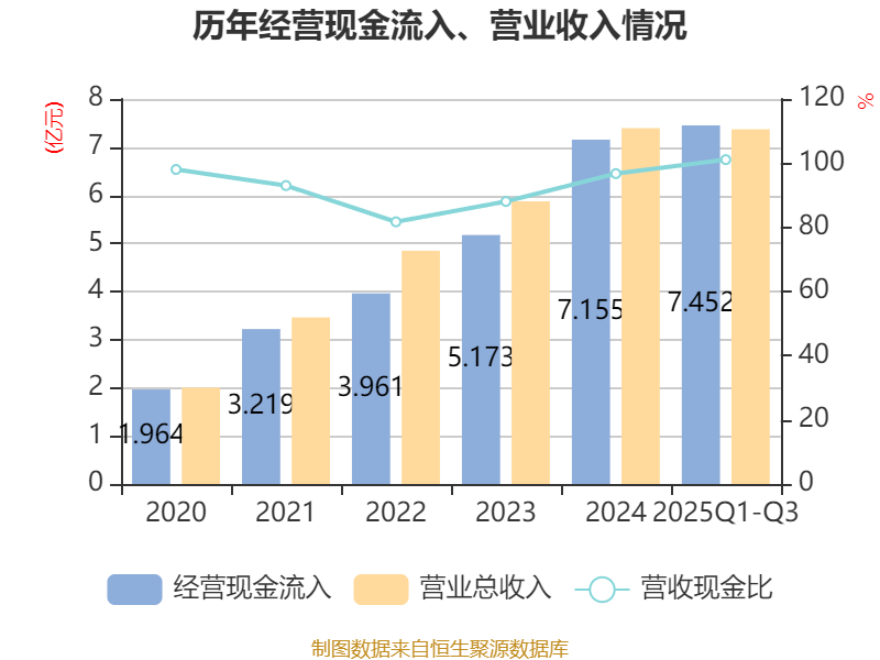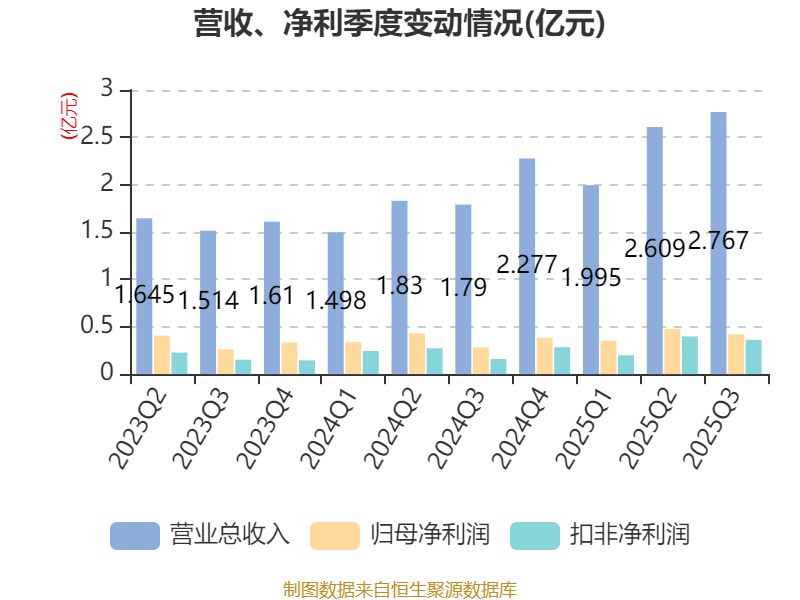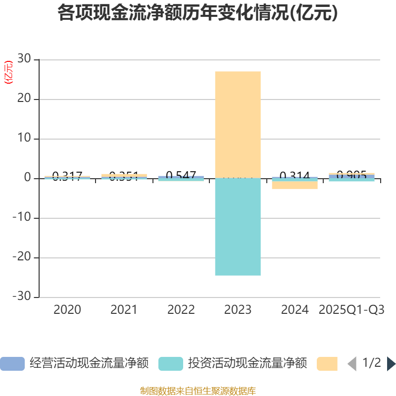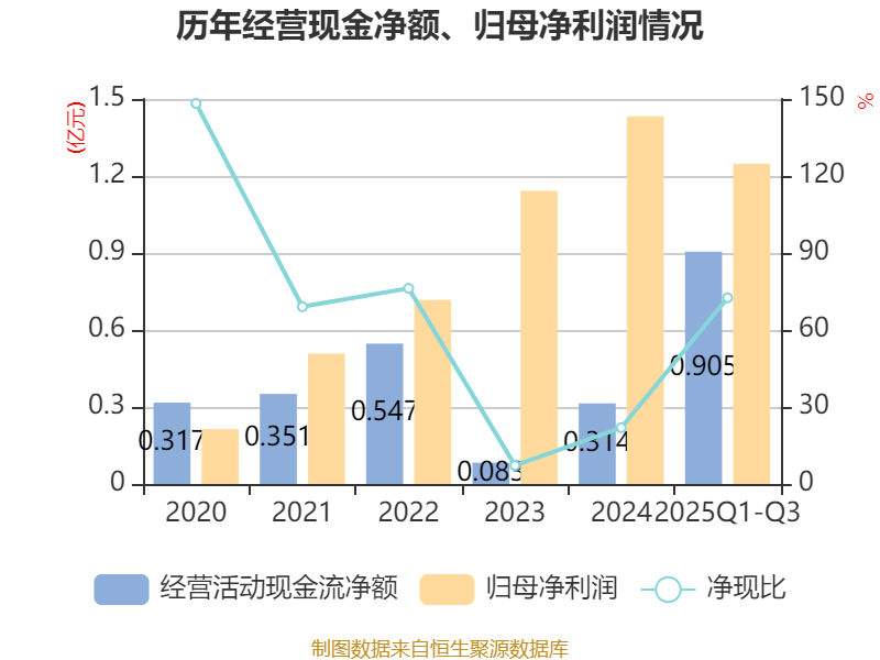2025年前三季度,公司经营活动现金流净额为9053.81万元,同比增加1.03亿元;筹资活动现金流净额3888.4万元,同比增加2.29亿元;投资活动现金流净额-7964.51万元,上年同期为-7048.77万元。