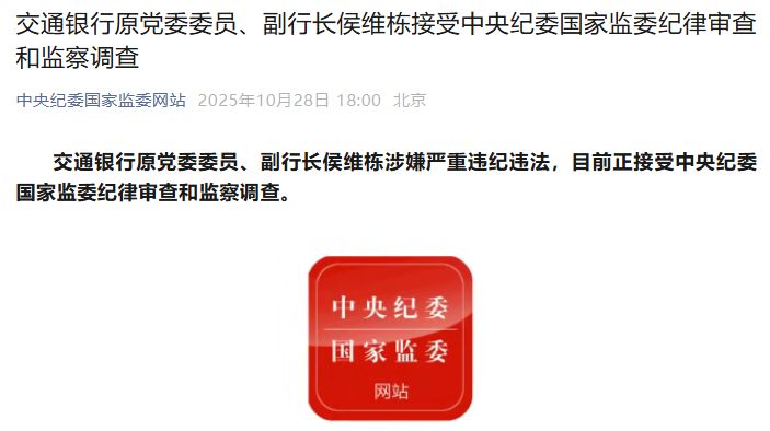 据中央纪委国家监委网站消息,交通银行原党委委员、副行长侯维栋涉嫌严重违纪违法,目前正接受中央纪委国家监委纪律审查和监察调查。