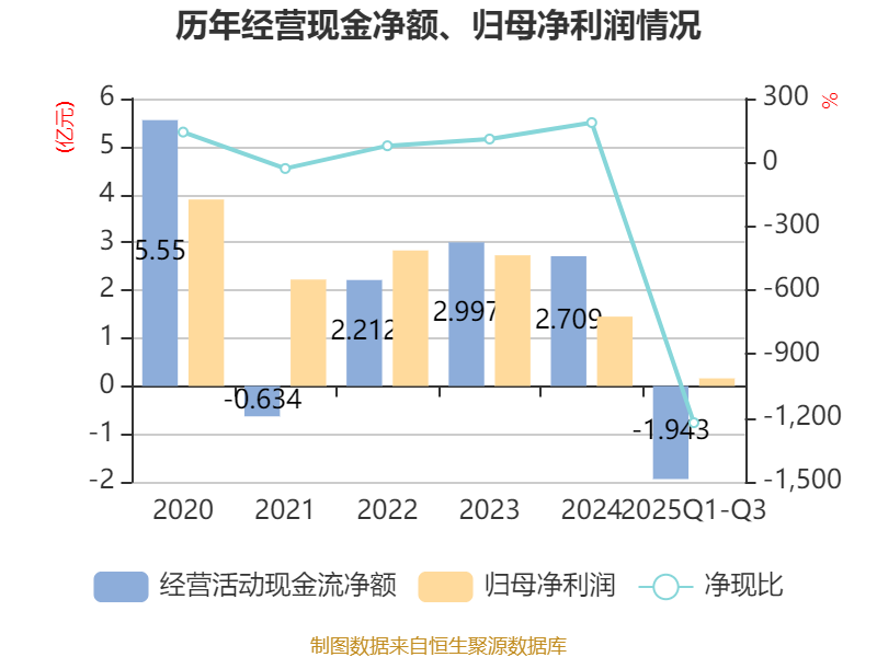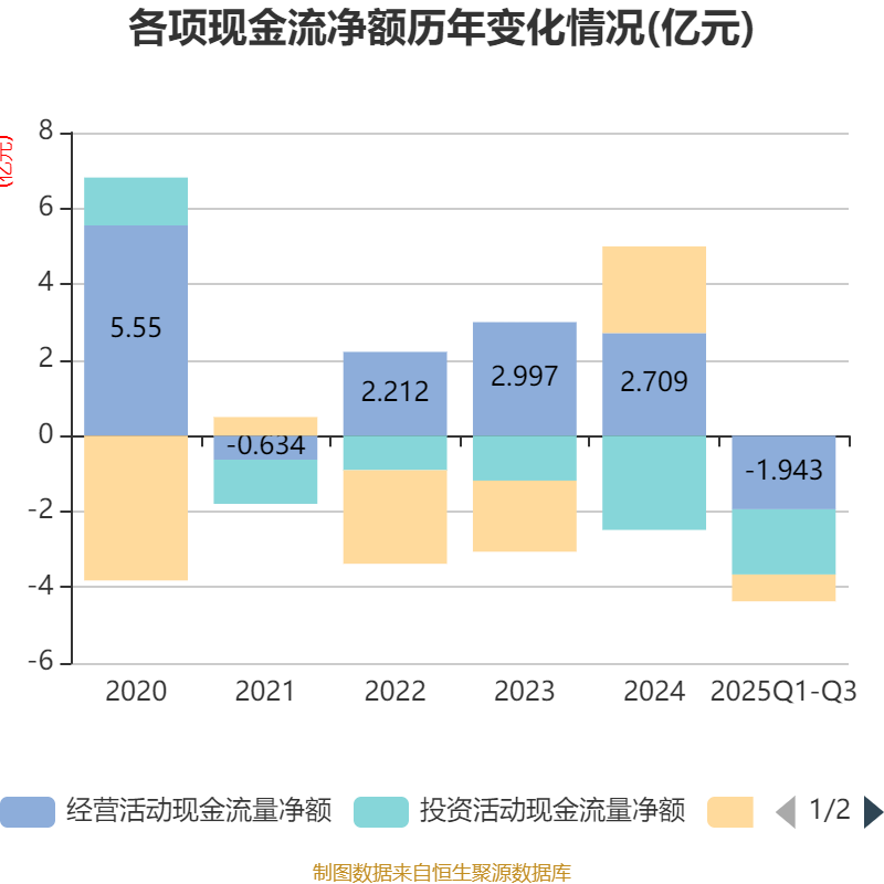 2025年前三季度,公司经营活动现金流净额为-1.94亿元,同比减少4101.63万元;筹资活动现金流净额-7076.17万元,同比减少3.87亿元;投资活动现金流净额-1.72亿元,上年同期为-2.11亿元。