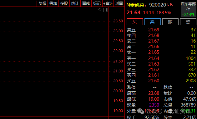 10月28日,泰凯英(920020)正式登陆北交所,开盘价19.05元/股,较发行价上涨154%,截至收盘,股价为21.64元,涨幅188.5%。