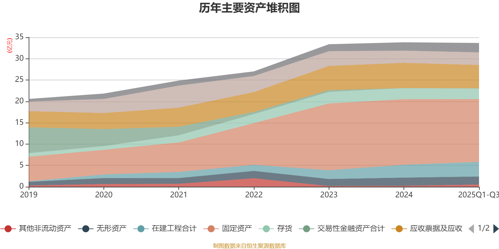 资产重大变化方面,截至2025年三季度末,公司固定资产较上年末减少4.01%,占公司总资产比重下降1.61个百分点;应收票据及应收账款较上年末减少7.55%,占公司总资产比重下降1.24个百分点;在建工程合计较上年末增加12.98%,占公司总资产比重上升1.21个百分点;其他非流动资产较上年末增加130.92%,占公司总资产比重上升0.87个百分点。