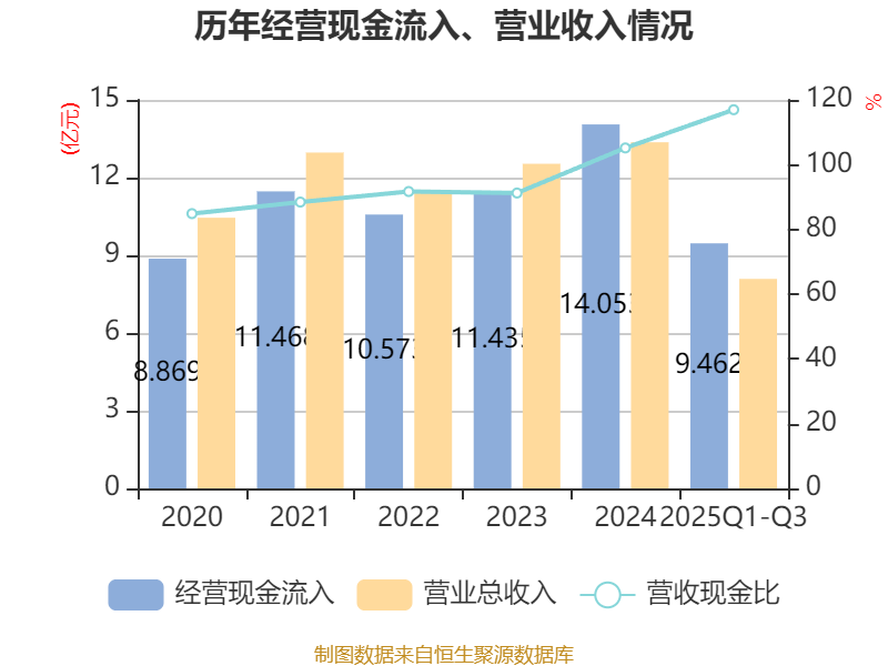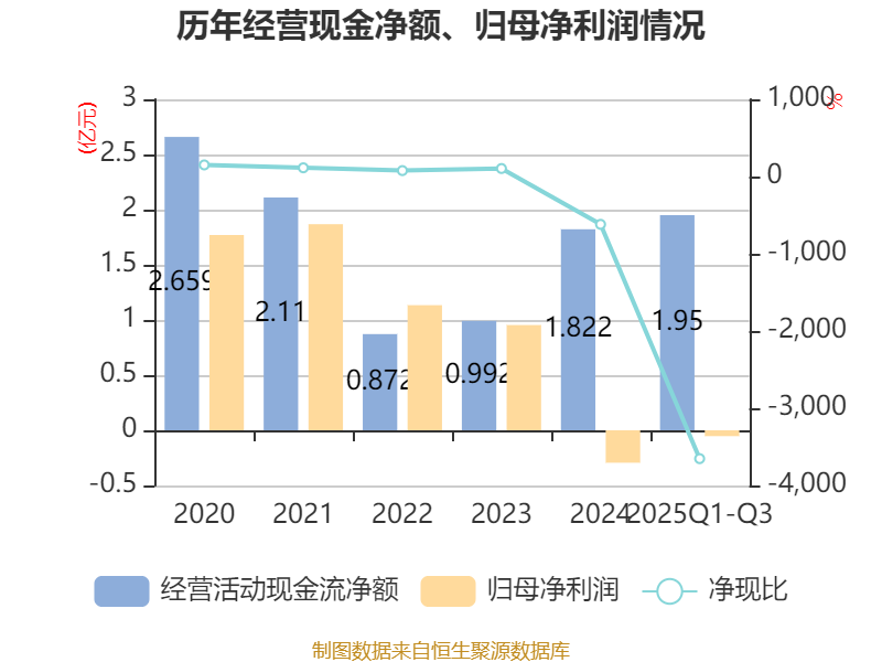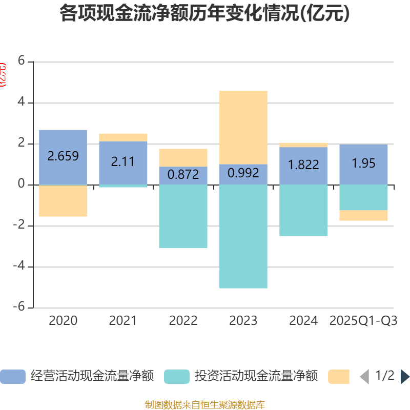 2025年前三季度,公司经营活动现金流净额为1.95亿元,同比增长53.53%;筹资活动现金流净额-5115.66万元,同比减少1.54亿元;投资活动现金流净额-1.26亿元,上年同期为-2.12亿元。