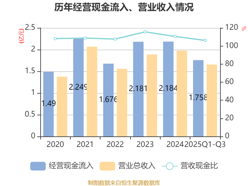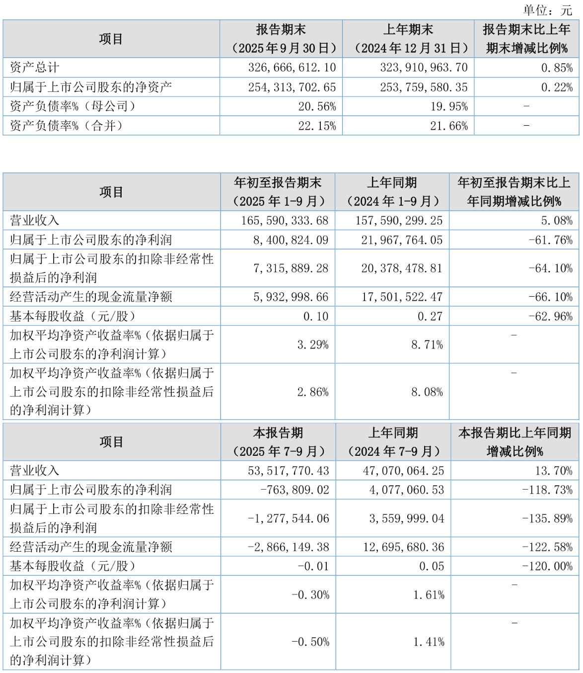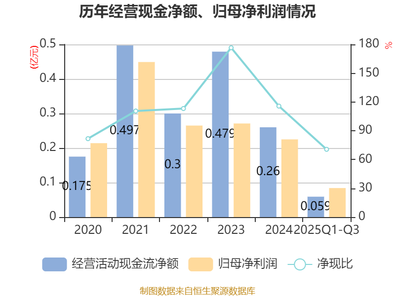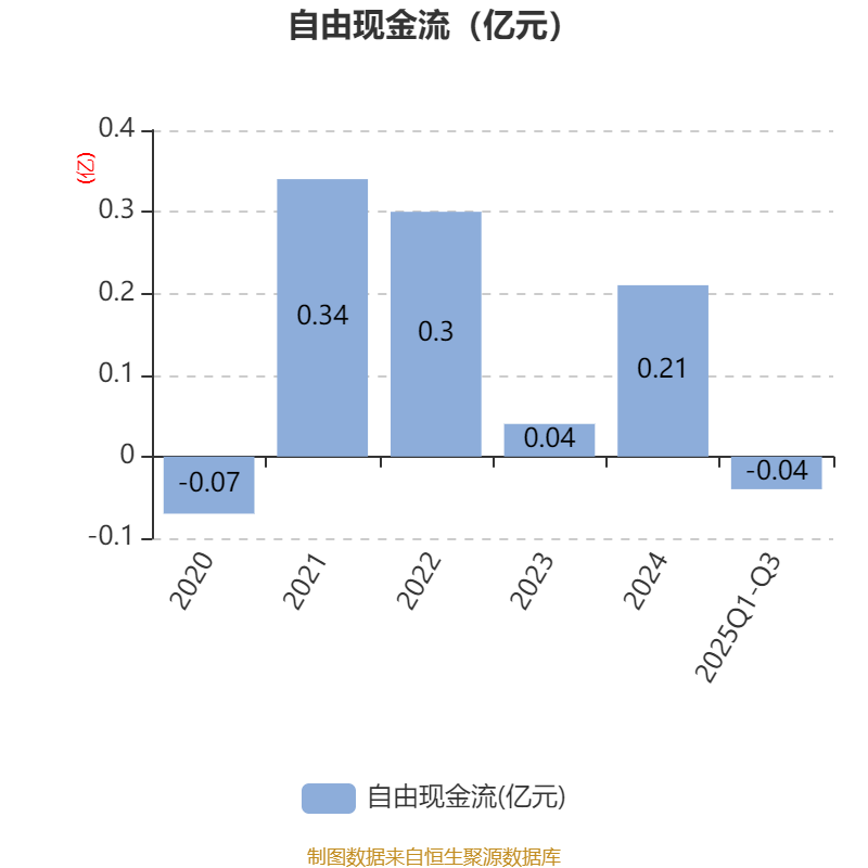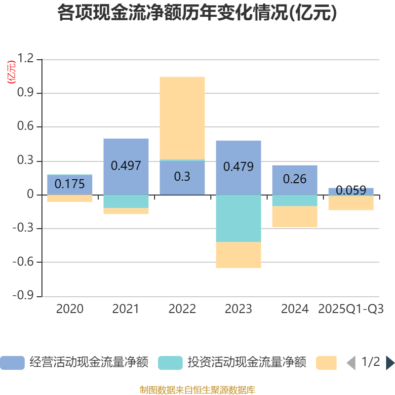 2025年前三季度,公司经营活动现金流净额为593.3万元,同比下降66.1%;筹资活动现金流净额-1246.38万元,同比增加434.09万元;投资活动现金流净额-117.2万元,上年同期为-811.05万元。
