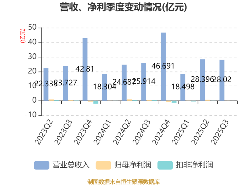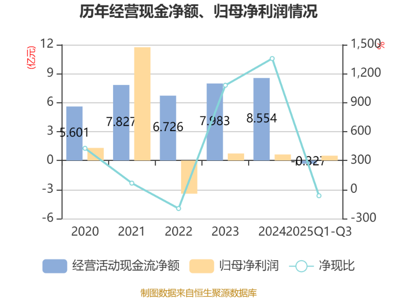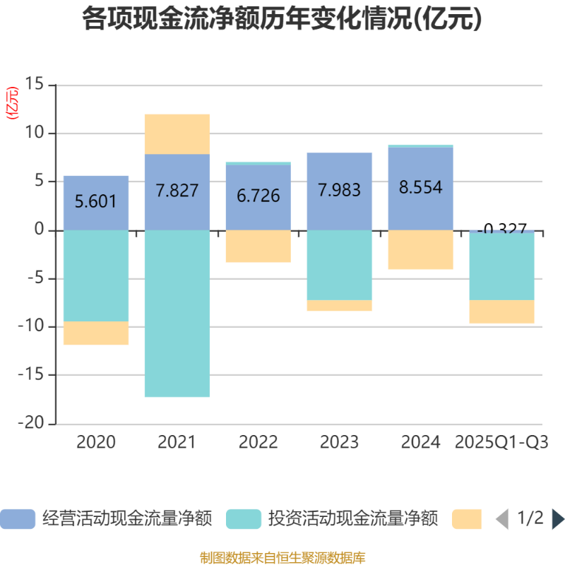 2025年前三季度,公司经营活动现金流净额为-3273.04万元,同比增加1.95亿元;筹资活动现金流净额-2.4亿元,同比增加1.41亿元;投资活动现金流净额-6.91亿元,上年同期为-9017.97万元。