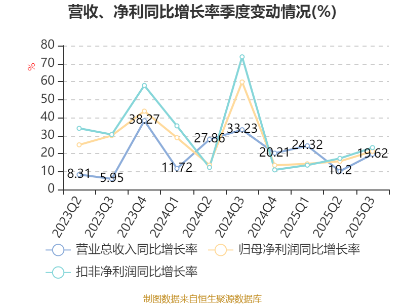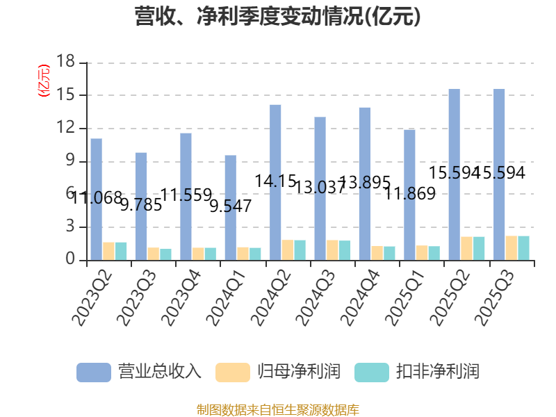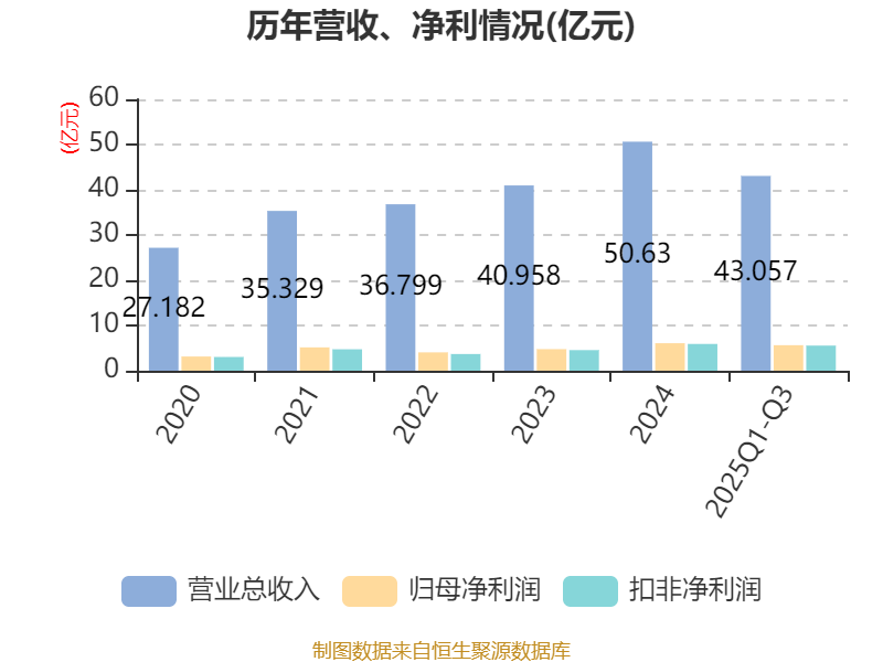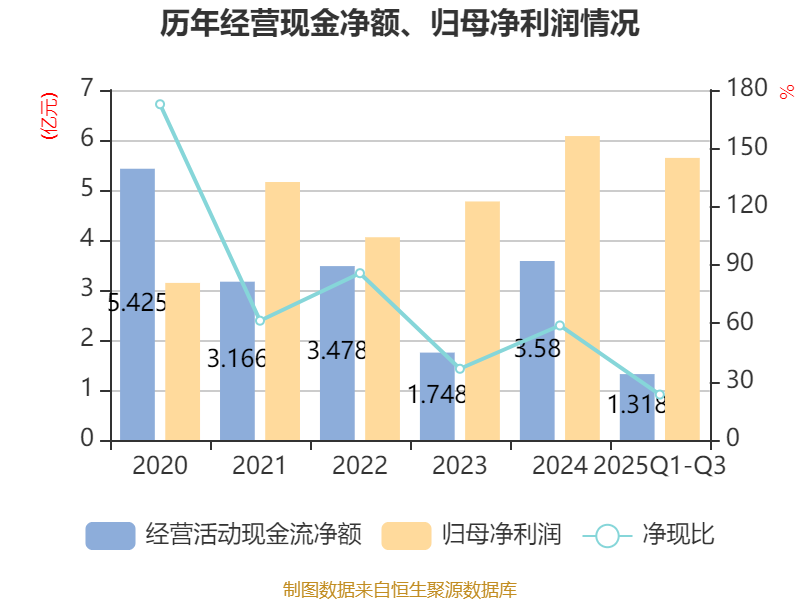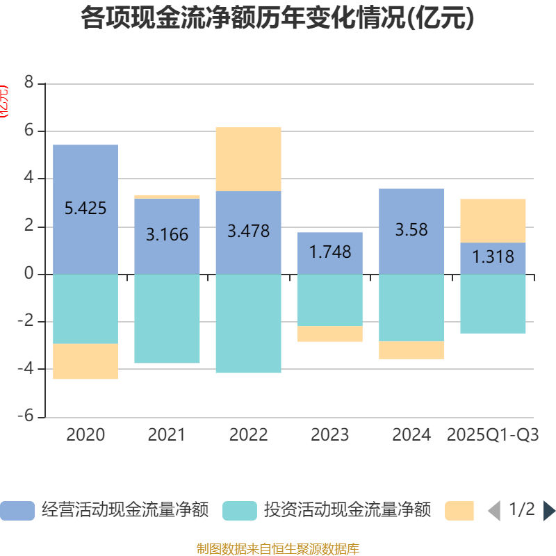 2025年前三季度,公司经营活动现金流净额为1.32亿元,同比增长24.93%;筹资活动现金流净额1.83亿元,同比增加2.5亿元;投资活动现金流净额-2.5亿元,上年同期为-2.28亿元。