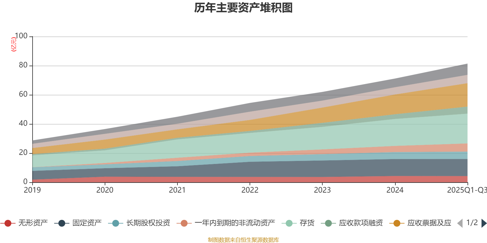 资产重大变化方面,截至2025年三季度末,公司固定资产较上年末增加0.89%,占公司总资产比重下降1.93个百分点;应收款项融资较上年末增加49.75%,占公司总资产比重上升1.4个百分点;一年内到期的非流动资产较上年末增加33.34%,占公司总资产比重上升0.98个百分点;在建工程合计较上年末增加162.51%,占公司总资产比重上升0.96个百分点。