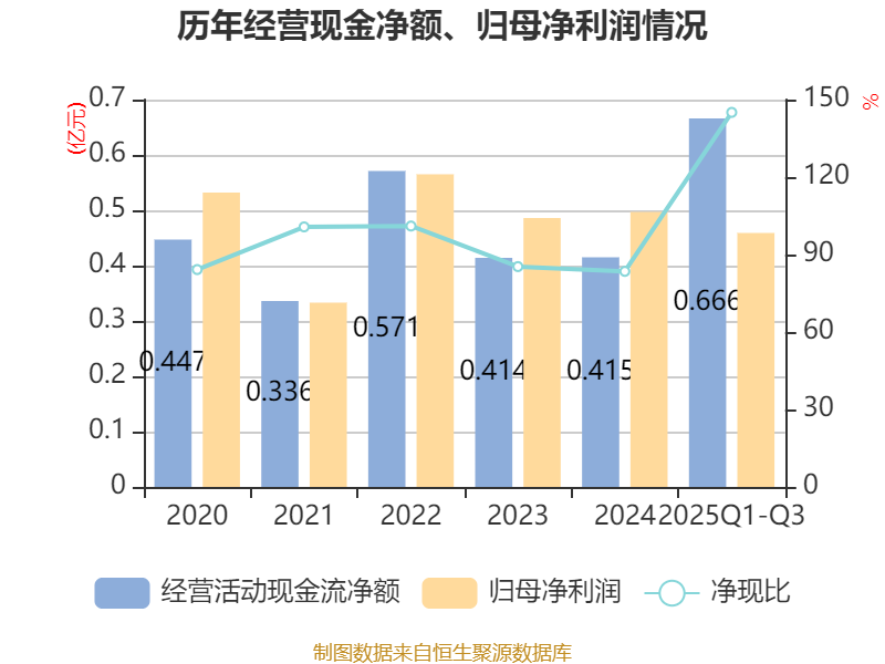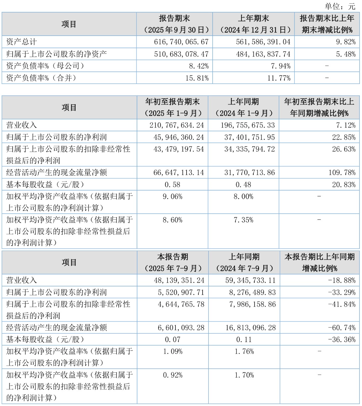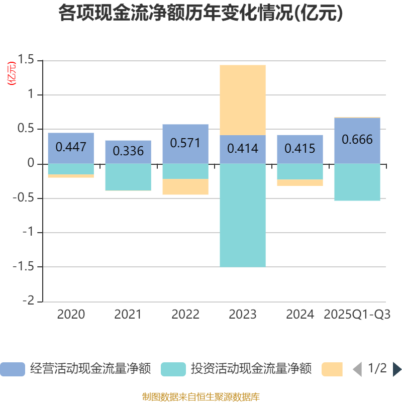 2025年前三季度,公司经营活动现金流净额为6664.71万元,同比增长109.78%;筹资活动现金流净额98.91万元,同比增加1723.13万元;投资活动现金流净额-5380.95万元,上年同期为4449.29万元。