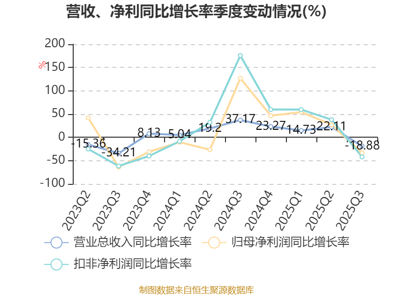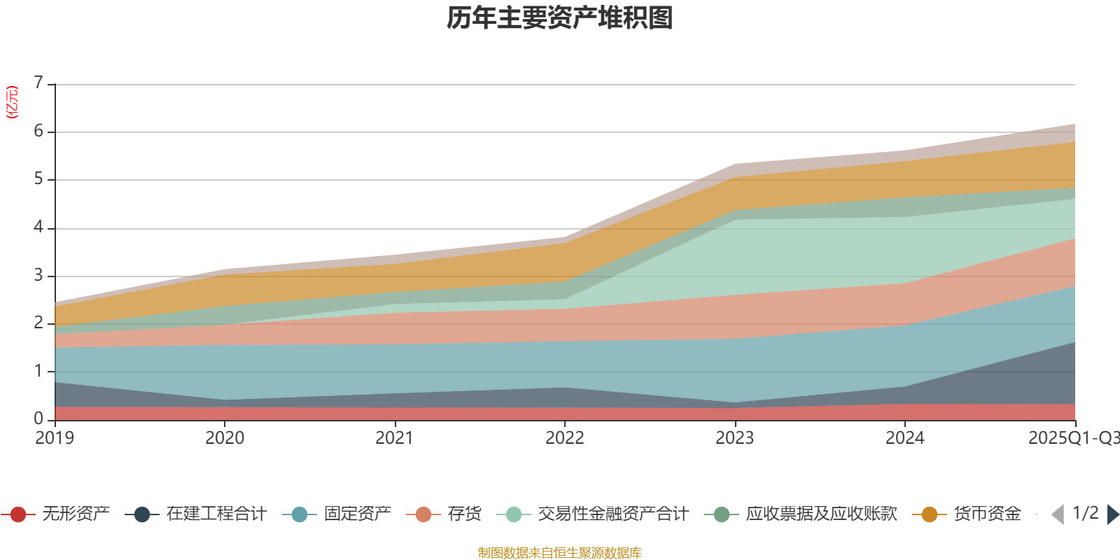 资产重大变化方面,截至2025年三季度末,公司在建工程合计较上年末增加257.16%,占公司总资产比重上升14.55个百分点;交易性金融资产合计较上年末减少40.47%,占公司总资产比重下降11.25个百分点;固定资产较上年末减少8.3%,占公司总资产比重下降3.73个百分点;应收票据及应收账款较上年末减少42.68%,占公司总资产比重下降3.48个百分点。