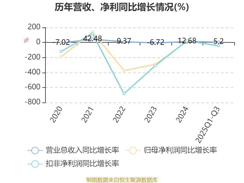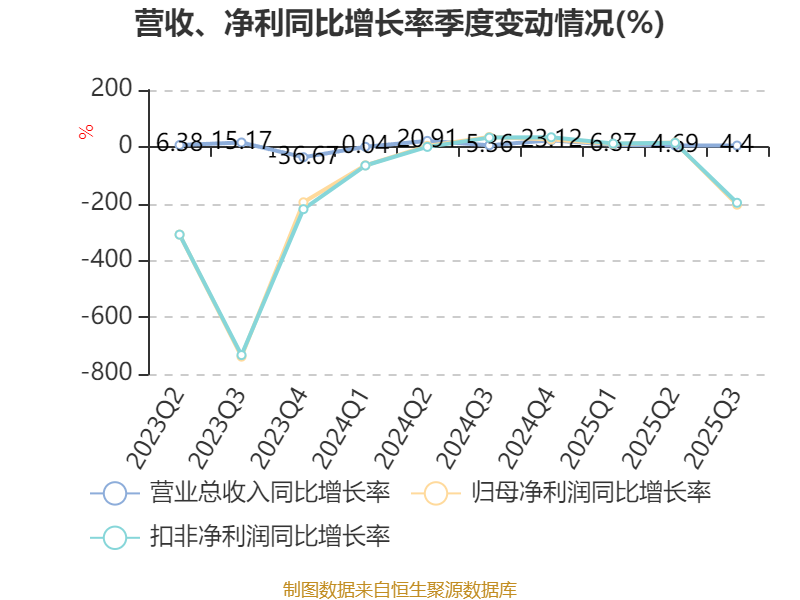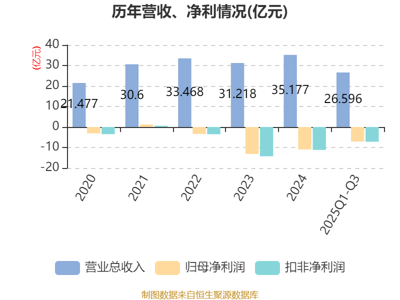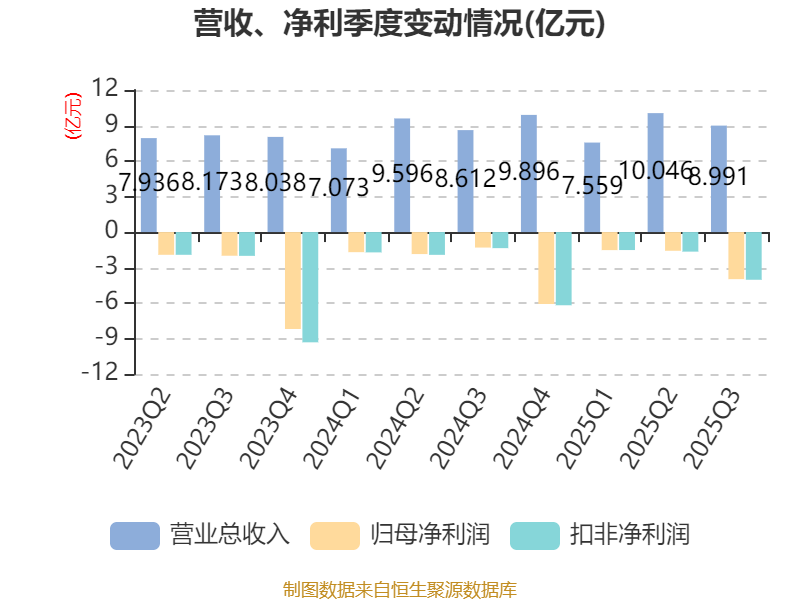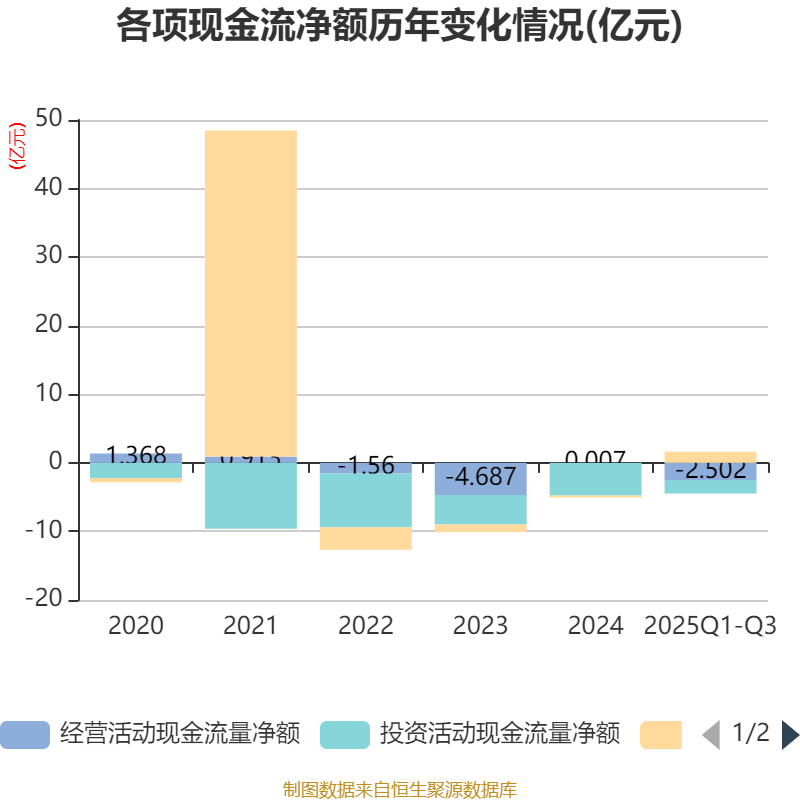 2025年前三季度,公司经营活动现金流净额为-2.5亿元,同比减少3.86亿元;筹资活动现金流净额1.62亿元,同比增加2.56亿元;投资活动现金流净额-1.97亿元,上年同期为-4亿元。