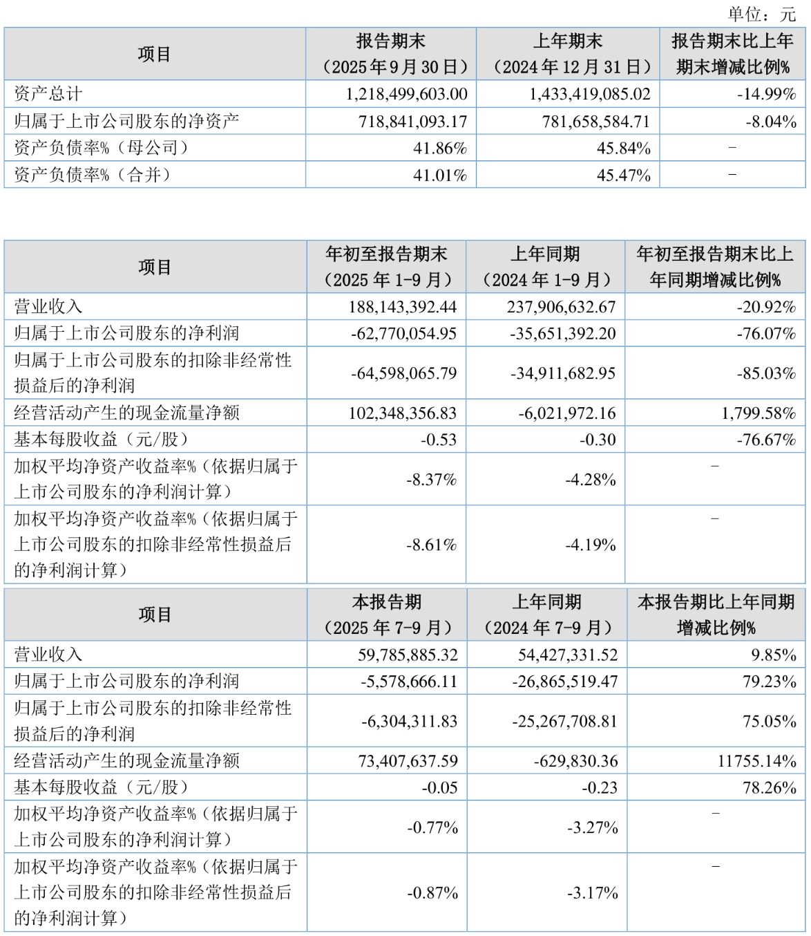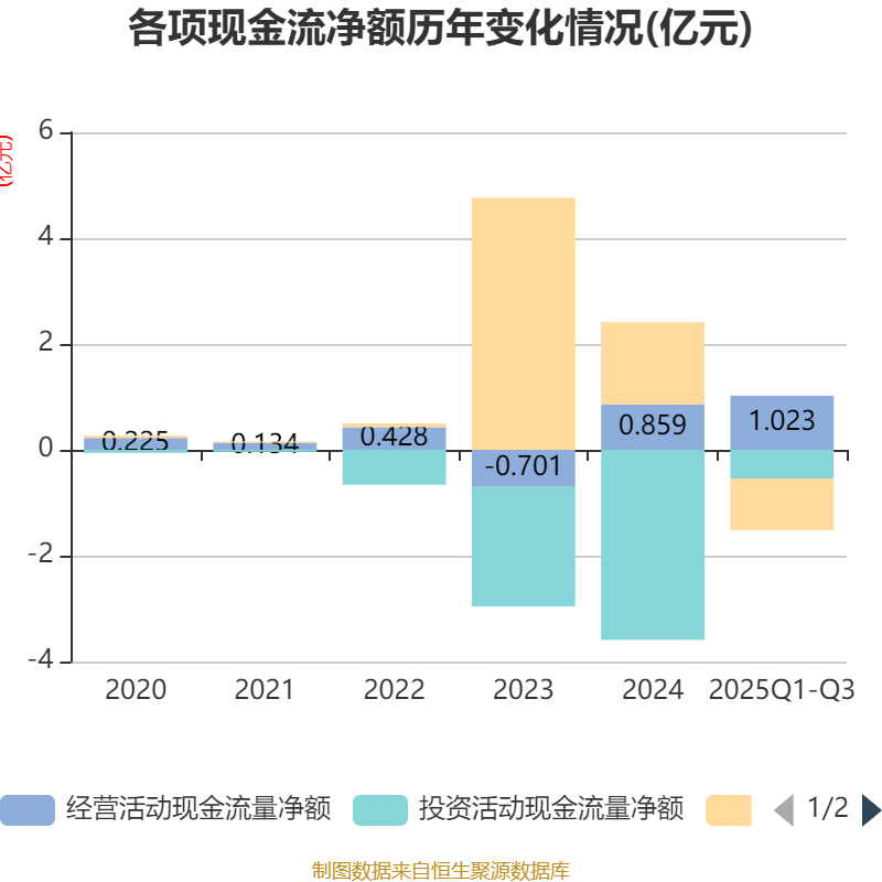 2025年前三季度,公司经营活动现金流净额为1.02亿元,同比增加1.08亿元;筹资活动现金流净额-9784.56万元,同比减少2.8亿元;投资活动现金流净额-5416.3万元,上年同期为-2.82亿元。