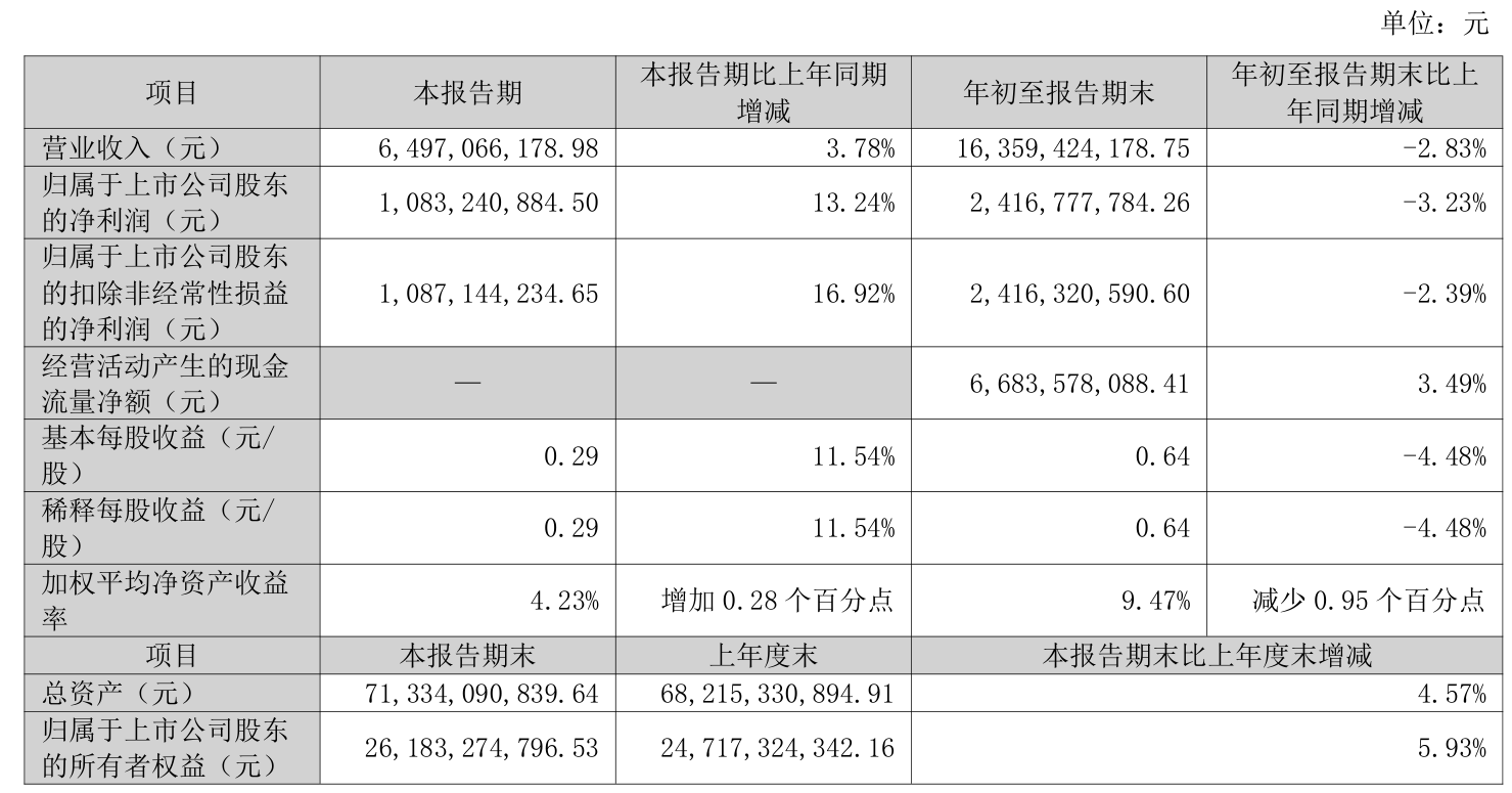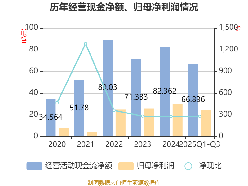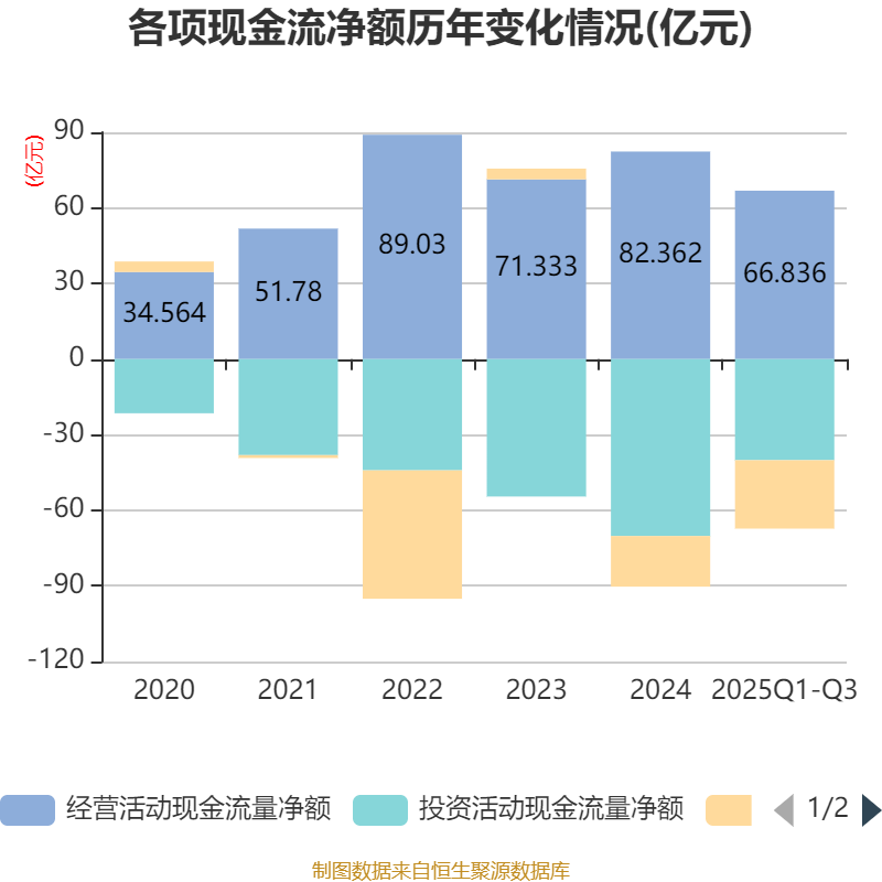 2025年前三季度,公司经营活动现金流净额为66.84亿元,同比增长3.49%;筹资活动现金流净额-27.16亿元,同比减少11.07亿元;投资活动现金流净额-40.12亿元,上年同期为-52.5亿元。