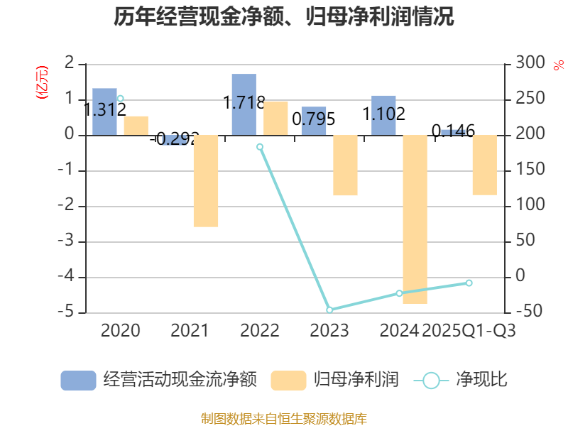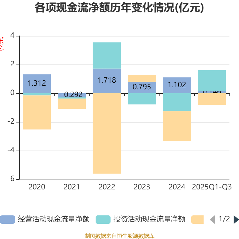 2025年前三季度,公司经营活动现金流净额为1455.92万元,同比下降68.21%;筹资活动现金流净额-8166.22万元,同比增加1.01亿元;投资活动现金流净额1.47亿元,上年同期为-8446.1万元。