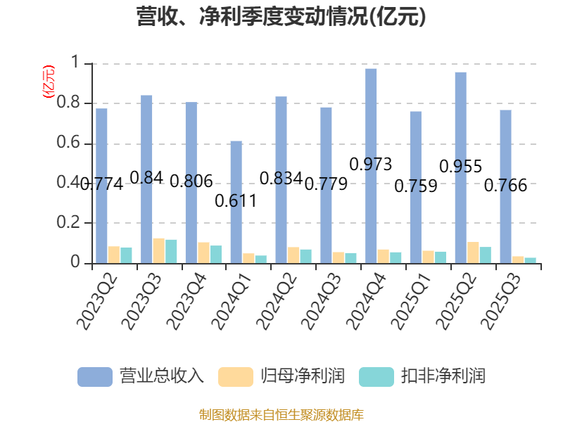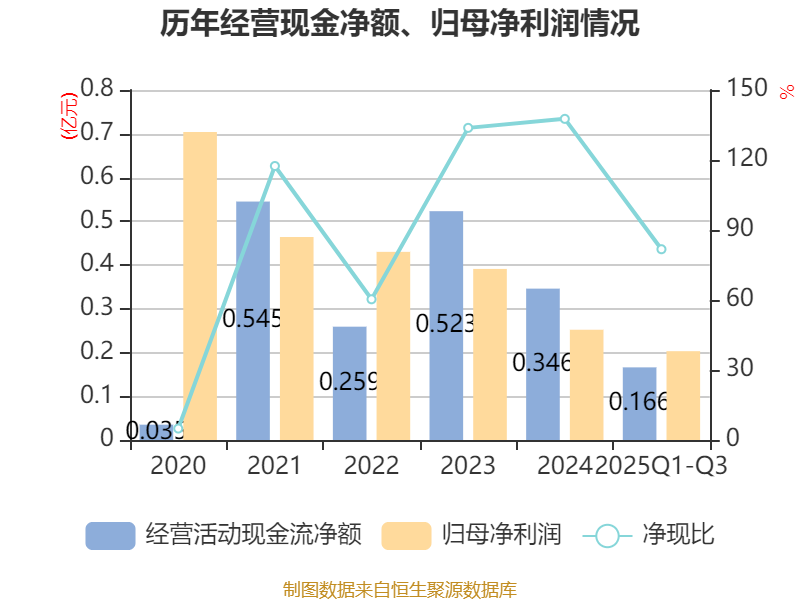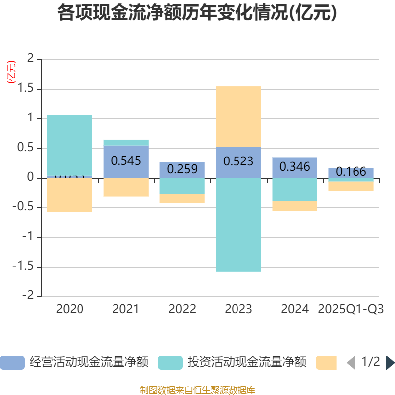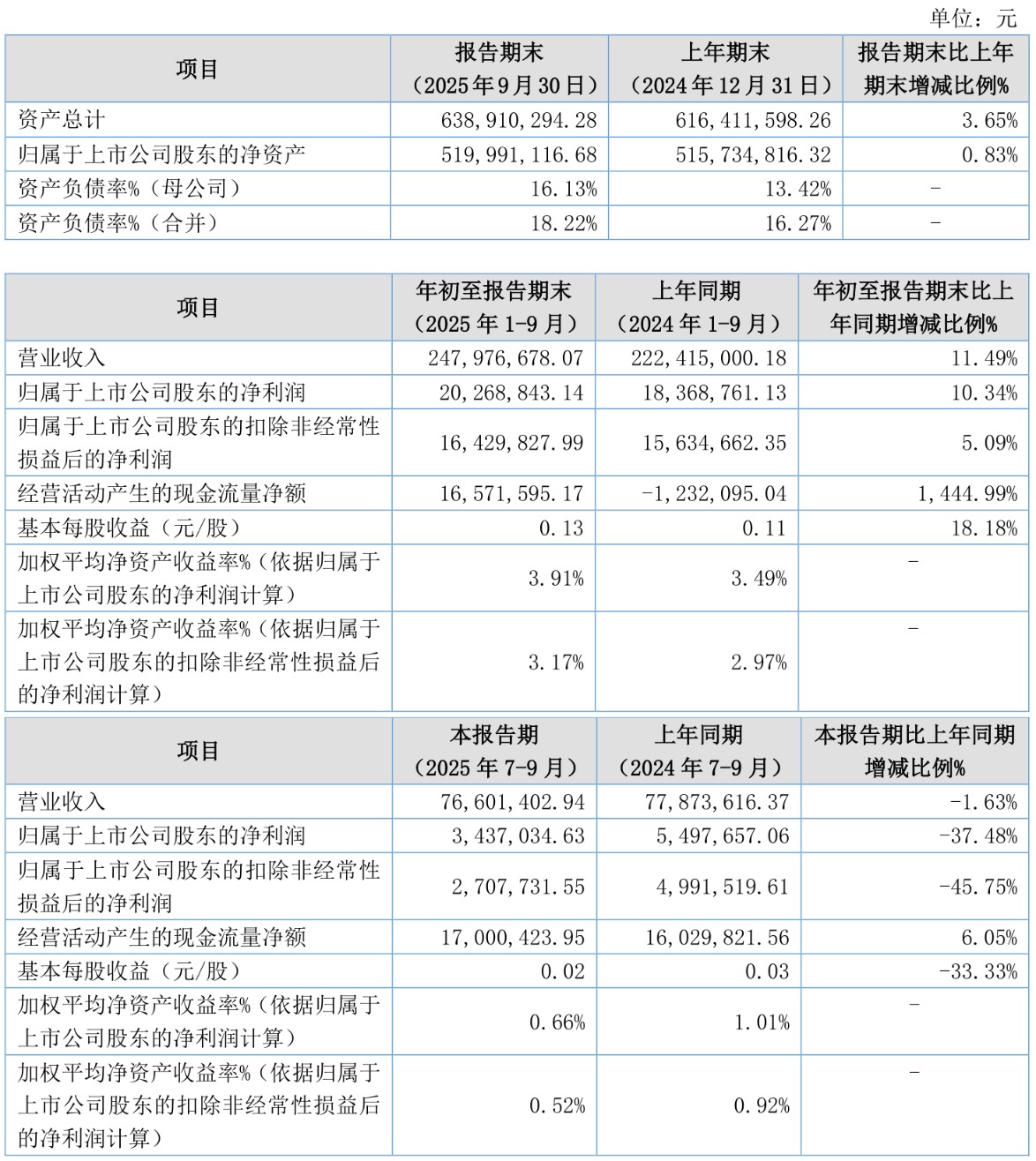 2025年前三季度,公司经营活动现金流净额为1657.16万元,同比增加1780.37万元;筹资活动现金流净额-1555.34万元,同比增加3047.29万元;投资活动现金流净额-644.13万元,上年同期为1526.23万元。