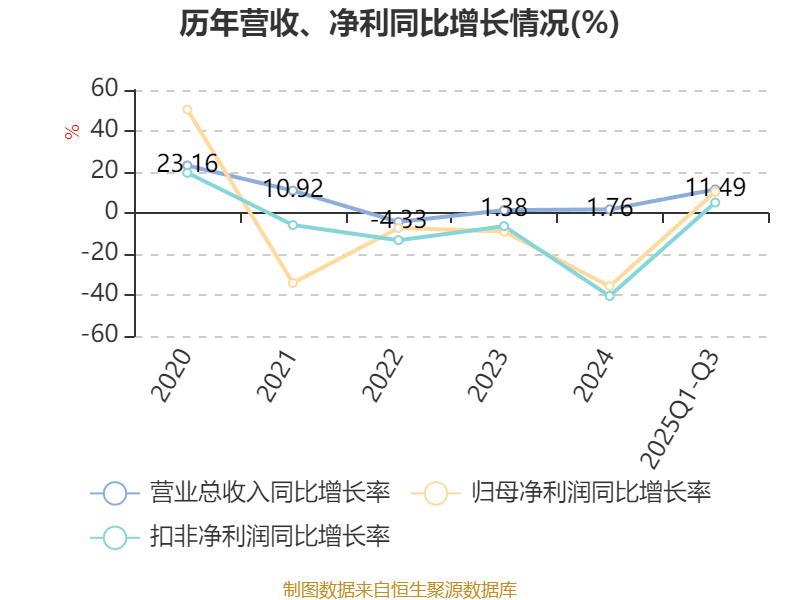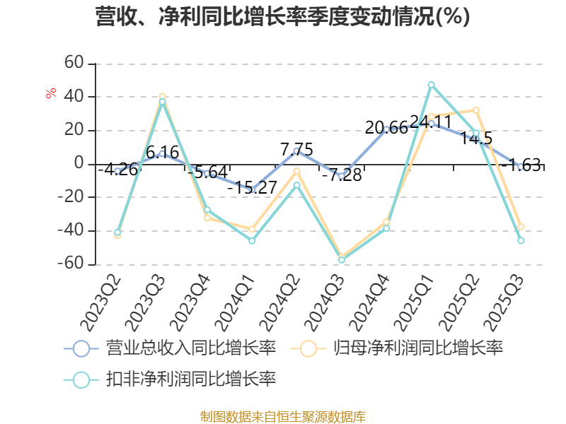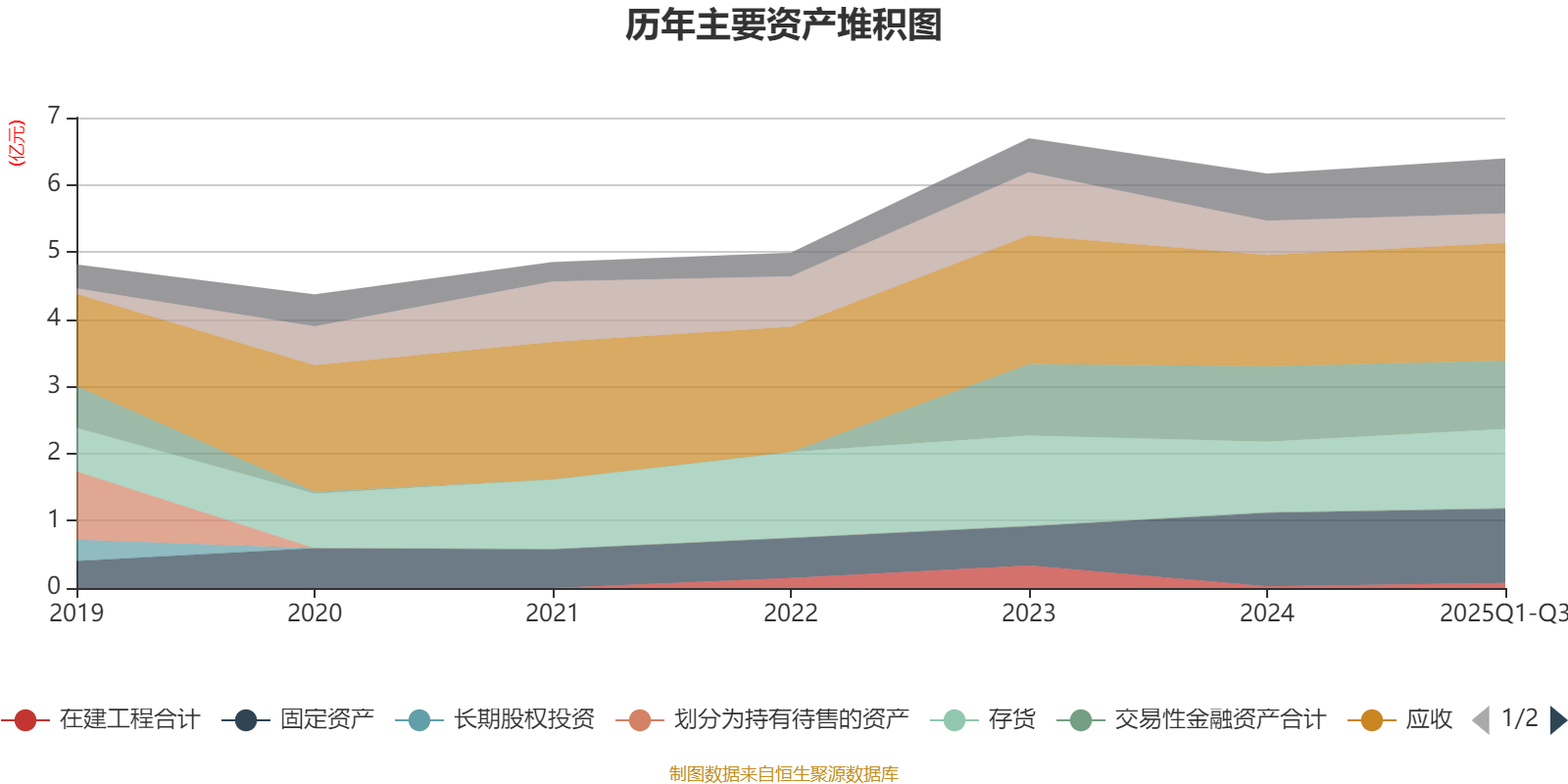 资产重大变化方面,截至2025年三季度末,公司交易性金融资产合计较上年末减少9.49%,占公司总资产比重下降2.31个百分点;存货较上年末增加12.09%,占公司总资产比重上升1.4个百分点;货币资金较上年末减少13.59%,占公司总资产比重下降1.38个百分点;在建工程合计较上年末增加220.46%,占公司总资产比重上升0.8个百分点。