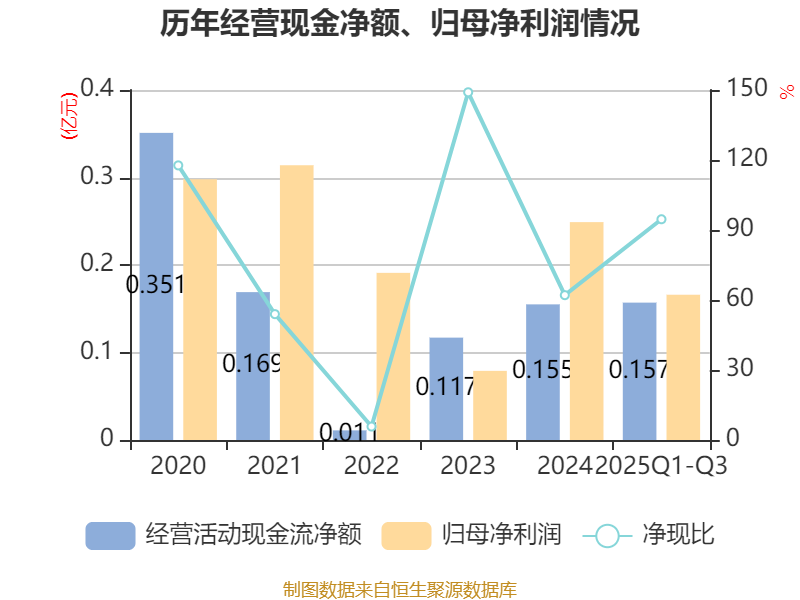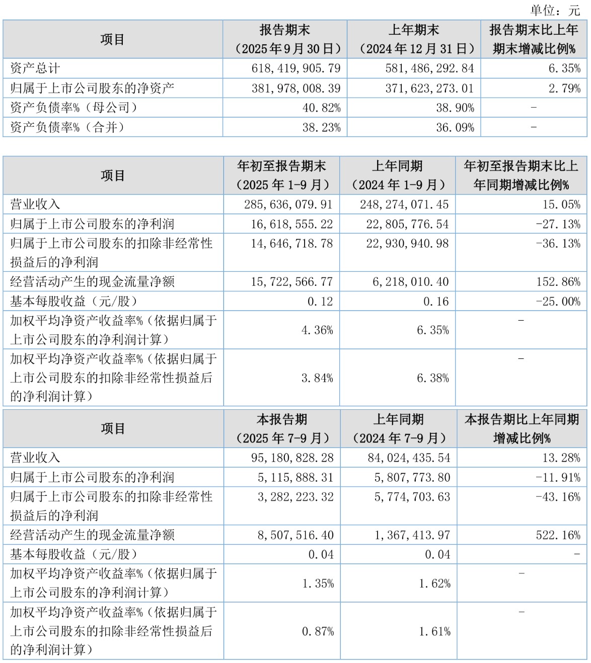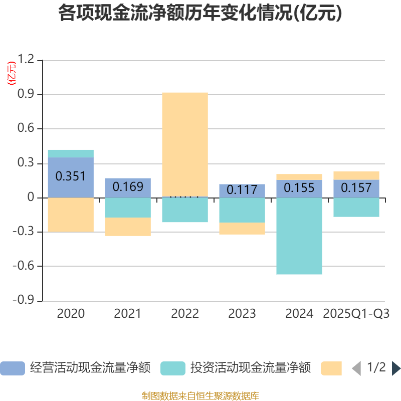 2025年前三季度,公司经营活动现金流净额为1572.26万元,同比增长152.86%;筹资活动现金流净额715.55万元,同比增加1178.54万元;投资活动现金流净额-1680.46万元,上年同期为-6233.86万元。