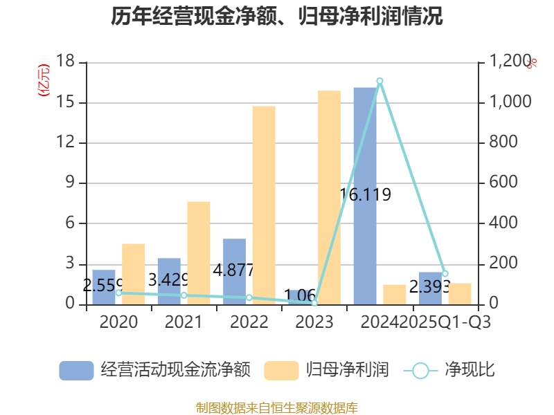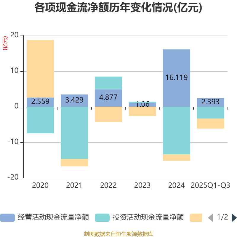 2025年前三季度,公司经营活动现金流净额为2.39亿元,同比下降81.84%;筹资活动现金流净额-2.8亿元,同比减少1.91亿元;投资活动现金流净额-3.37亿元,上年同期为-12.2亿元。