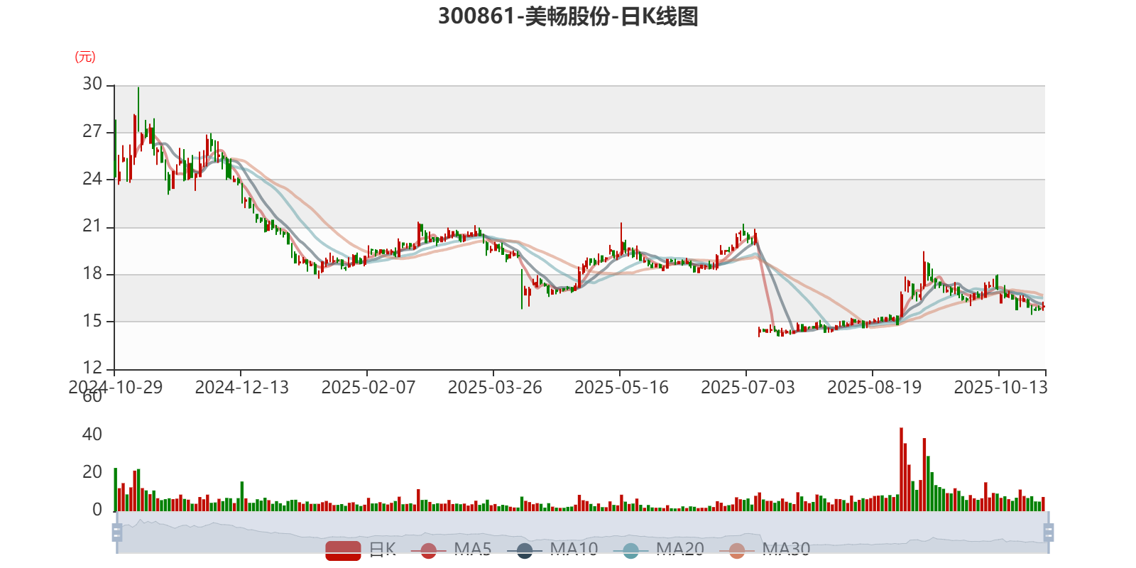 中证智能财讯美畅股份(300861)10月29日披露2025年第三季度报告。前三季度公司实现营业总收入15.19亿元,同比下降19.70%;归母净利润1.57亿元,同比下降44.24%;扣非净利润1.21亿元,同比下降50.51%;经营活动产生的现金流量净额为2.39亿元,同比下降81.84%;报告期内,美畅股份基本每股收益为0.2339元,加权平均净资产收益率为2.45%。
