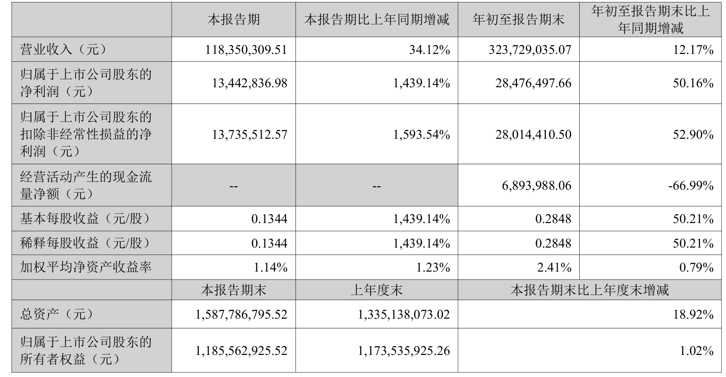 中证智能财讯润阳科技(300920)10月29日披露2025年第三季度报告。前三季度公司实现营业总收入3.24亿元,同比增长12.17%;归母净利润2847.65万元,同比增长50.16%;扣非净利润2801.44万元,同比增长52.90%;经营活动产生的现金流量净额为689.4万元,同比下降66.99%;报告期内,润阳科技基本每股收益为0.2848元,加权平均净资产收益率为2.41%。