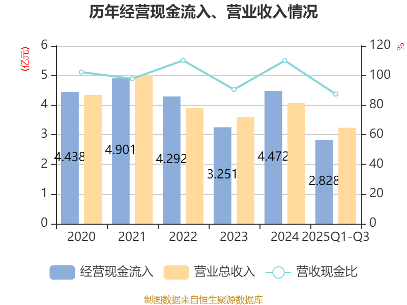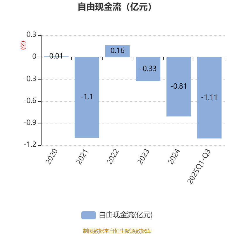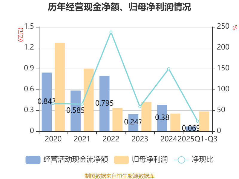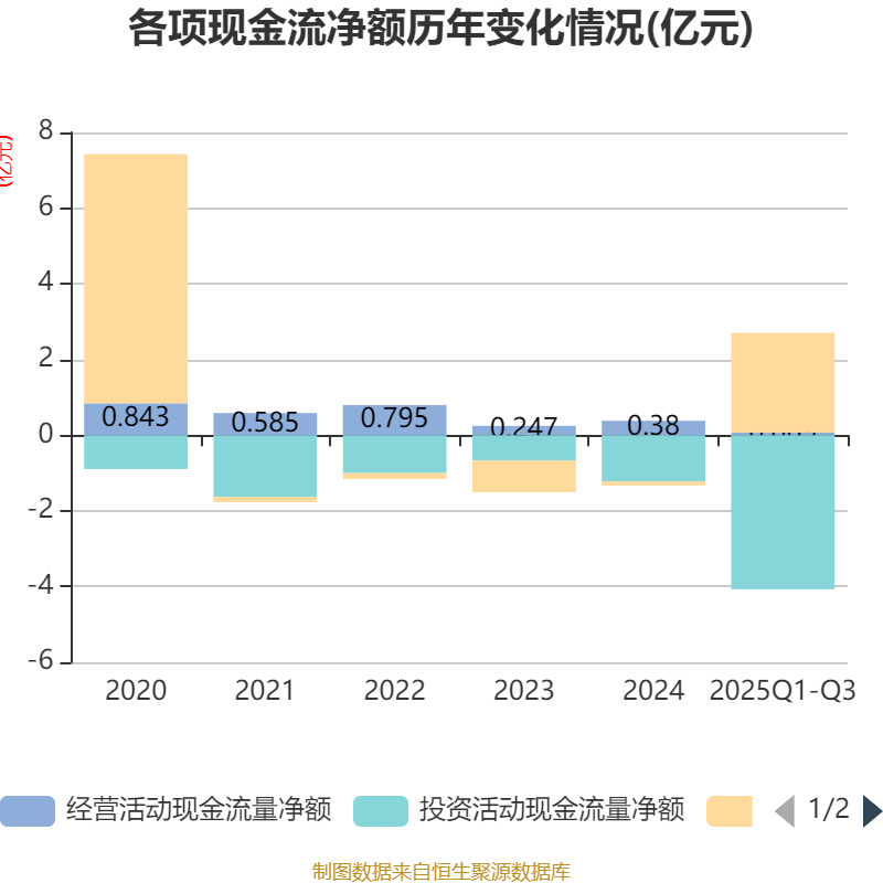 2025年前三季度,公司经营活动现金流净额为689.4万元,同比下降66.99%;筹资活动现金流净额2.63亿元,同比增加2.14亿元;投资活动现金流净额-4.07亿元,上年同期为-8436.81万元。