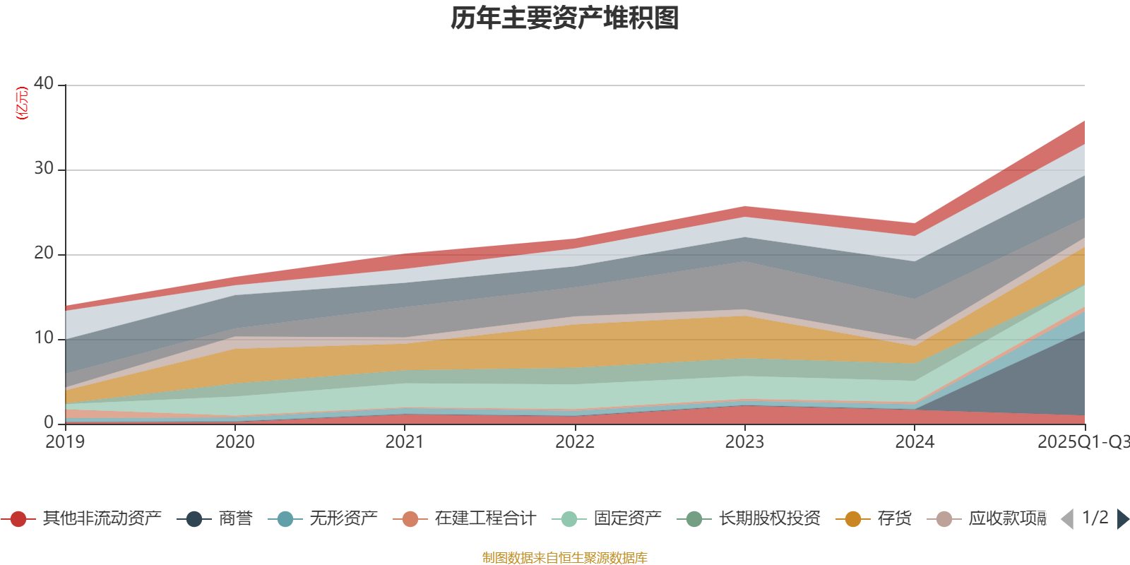 资产重大变化方面,截至2025年三季度末,公司商誉较上年末增加12747.33%,占公司总资产比重上升27.51个百分点;合同资产较上年末减少51.36%,占公司总资产比重下降13.76个百分点;长期股权投资较上年末减少94.99%,占公司总资产比重下降8.37个百分点;应收票据及应收账款较上年末增加13.02%,占公司总资产比重下降4.7个百分点。