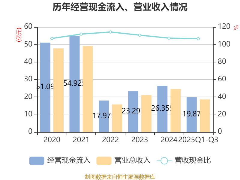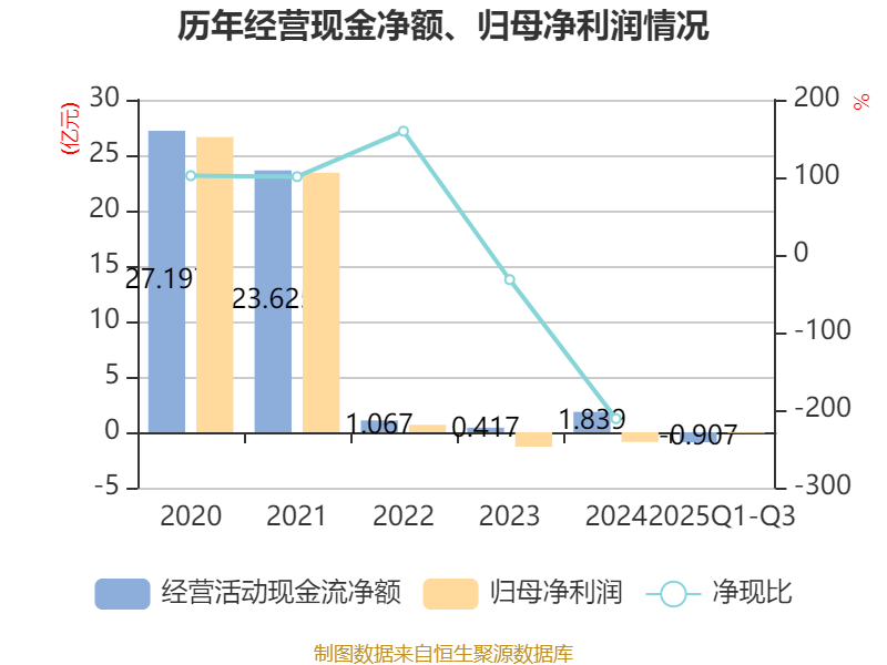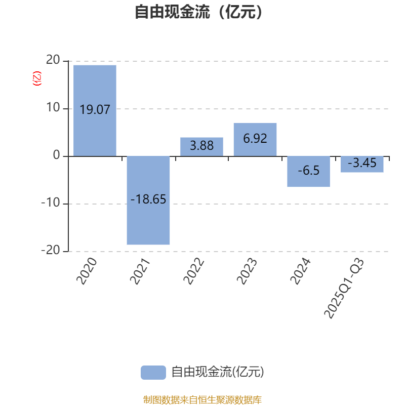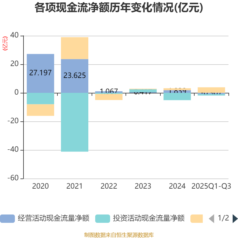 2025年前三季度,公司经营活动现金流净额为-9066.64万元,同比减少1.04亿元;筹资活动现金流净额3.87亿元,同比增加2.42亿元;投资活动现金流净额-1亿元,上年同期为4.77亿元。
