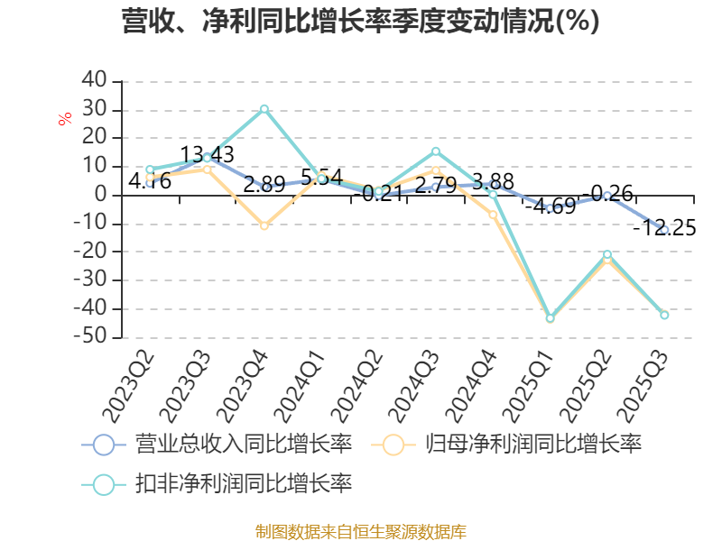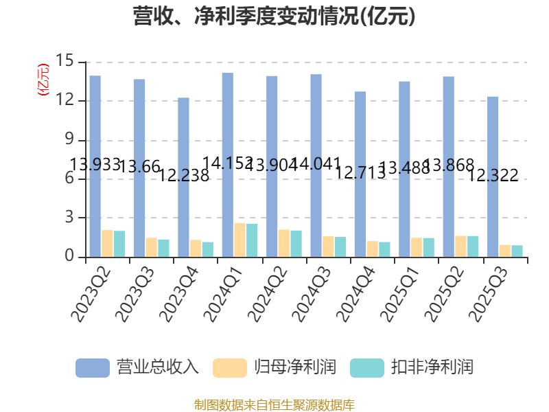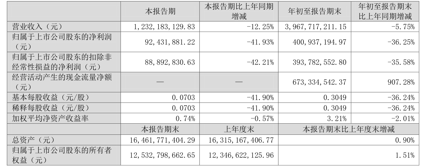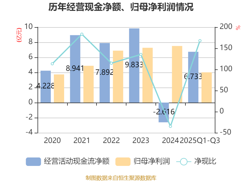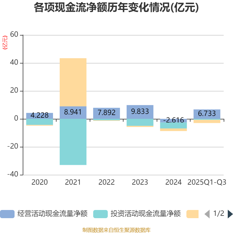 2025年前三季度,公司经营活动现金流净额为6.73亿元,同比增加7.57亿元;筹资活动现金流净额-2.3亿元,同比减少4718.85万元;投资活动现金流净额-7172.8万元,上年同期为-9532.67万元。