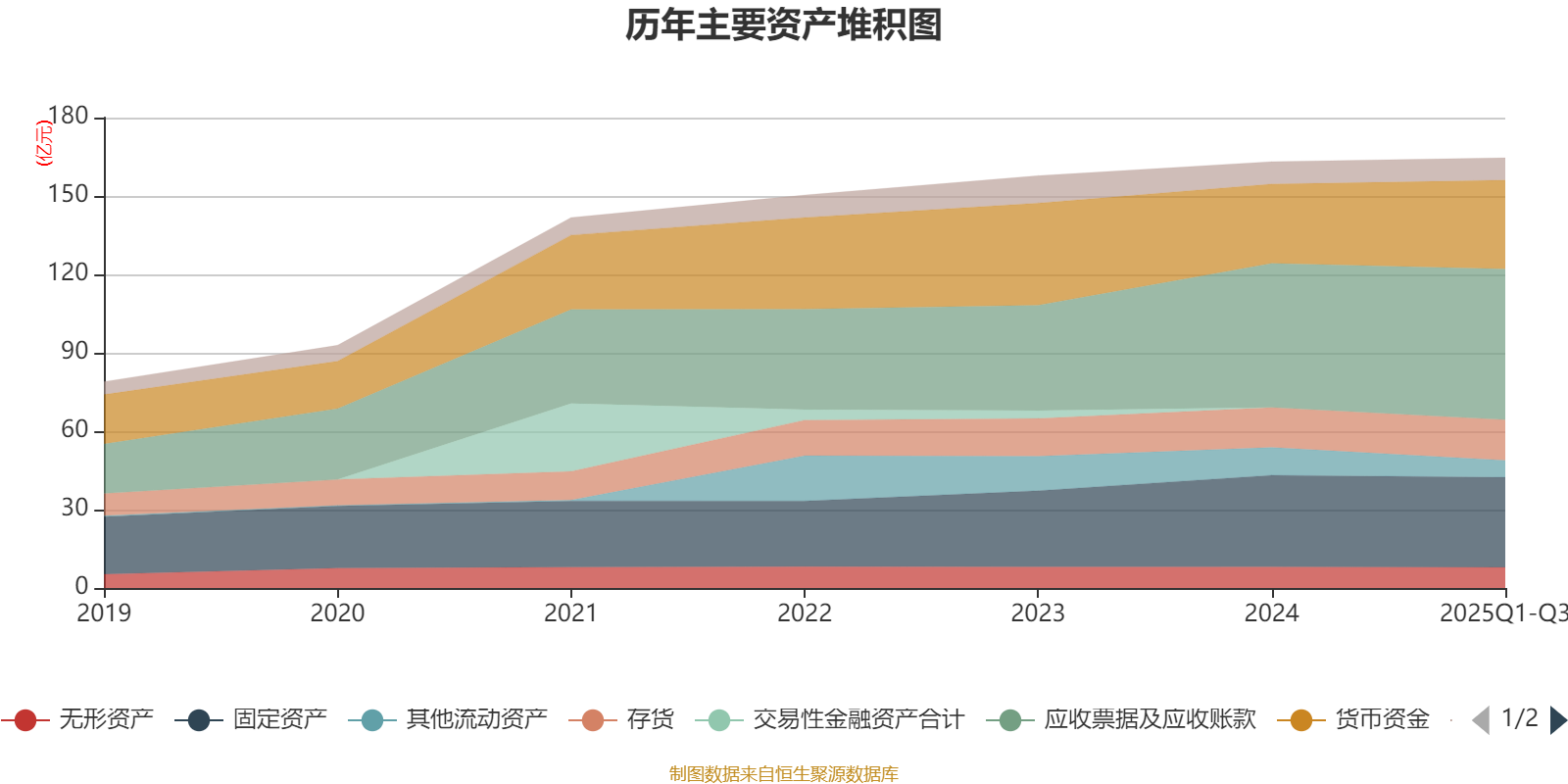资产重大变化方面,截至2025年三季度末,公司其他流动资产较上年末减少39.12%,占公司总资产比重下降2.6个百分点;货币资金较上年末增加12.2%,占公司总资产比重上升2.08个百分点;应收票据及应收账款较上年末增加4.61%,占公司总资产比重上升1.24个百分点;固定资产较上年末减少1.62%,占公司总资产比重下降0.54个百分点。