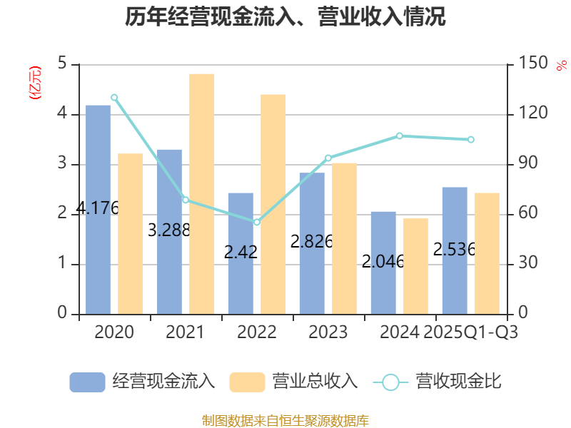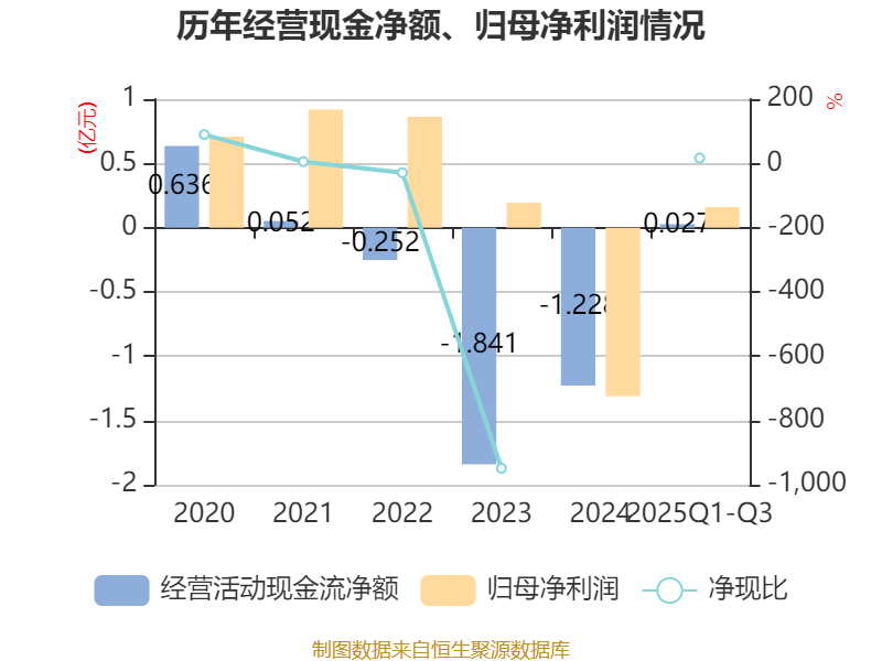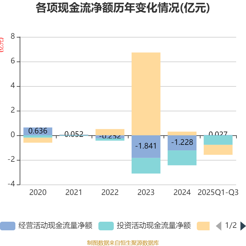 2025年前三季度,公司经营活动现金流净额为268.67万元,同比增加1.45亿元;筹资活动现金流净额-8137.42万元,同比减少9046.57万元;投资活动现金流净额-7719.37万元,上年同期为-1.29亿元。