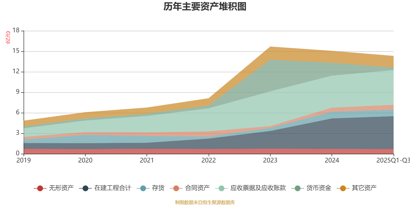 资产重大变化方面,截至2025年三季度末,公司货币资金较上年末减少80.85%,占公司总资产比重下降10.02个百分点;应收票据及应收账款较上年末增加8.49%,占公司总资产比重上升4.39个百分点;在建工程合计较上年末增加7.97%,占公司总资产比重上升4.01个百分点;合同资产较上年末增加23.7%,占公司总资产比重上升1.19个百分点。