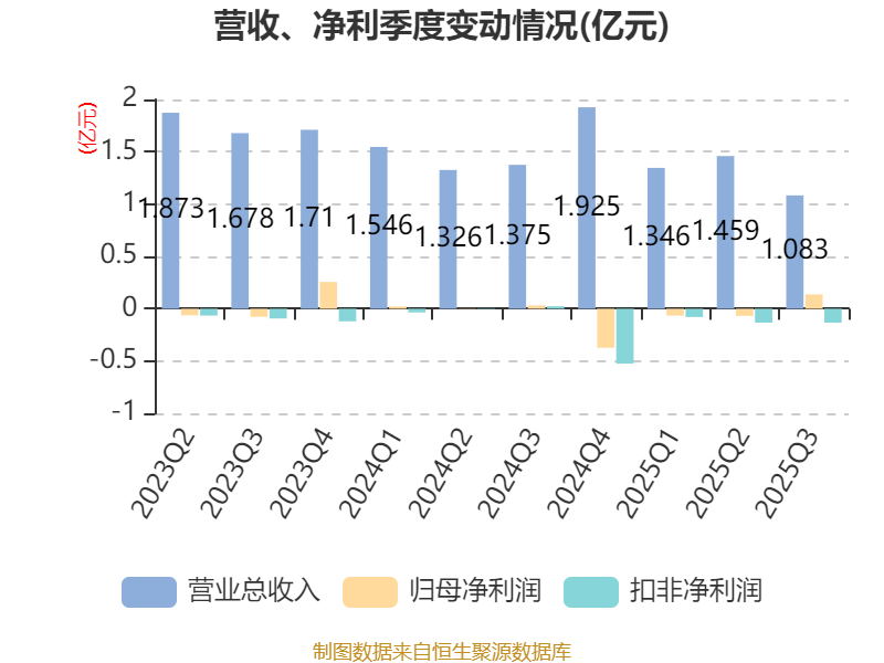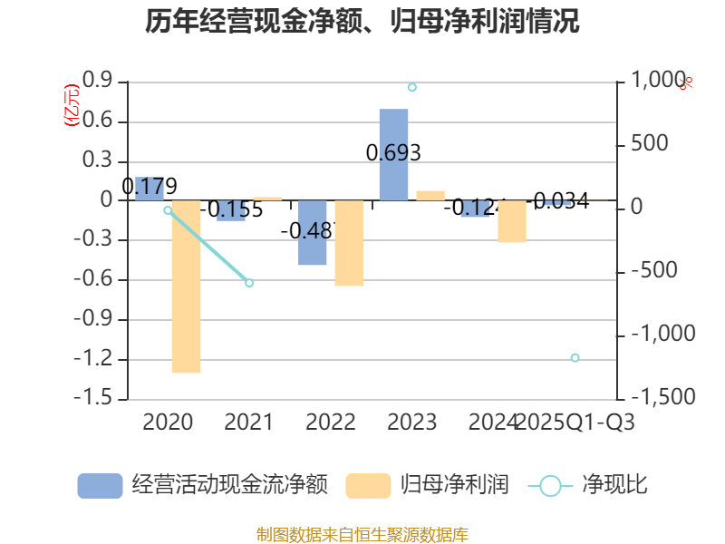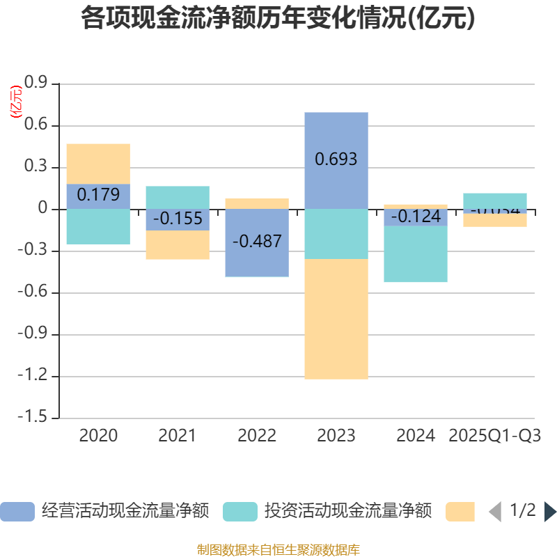 2025年前三季度,公司经营活动现金流净额为-341.76万元,同比增加2627.67万元;筹资活动现金流净额-946.24万元,同比减少622.27万元;投资活动现金流净额1124.99万元,上年同期为-3010.13万元。