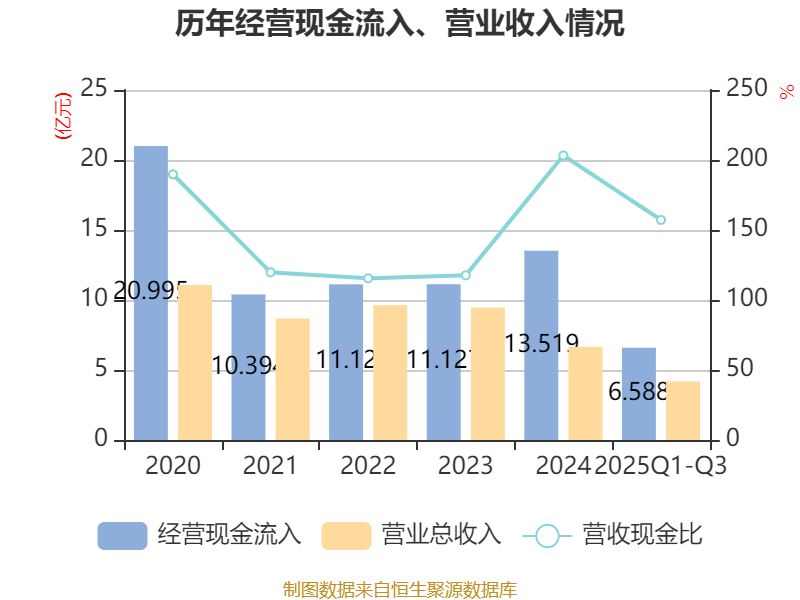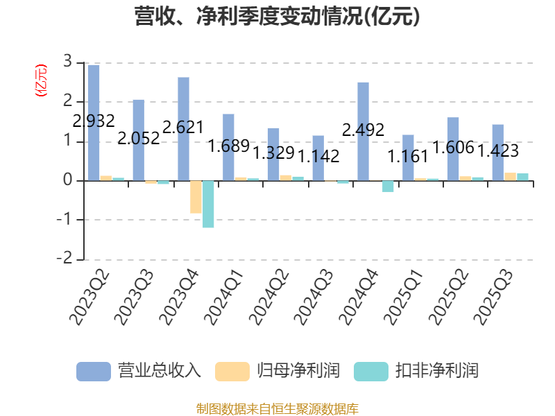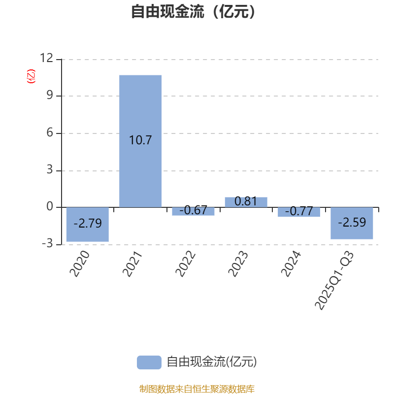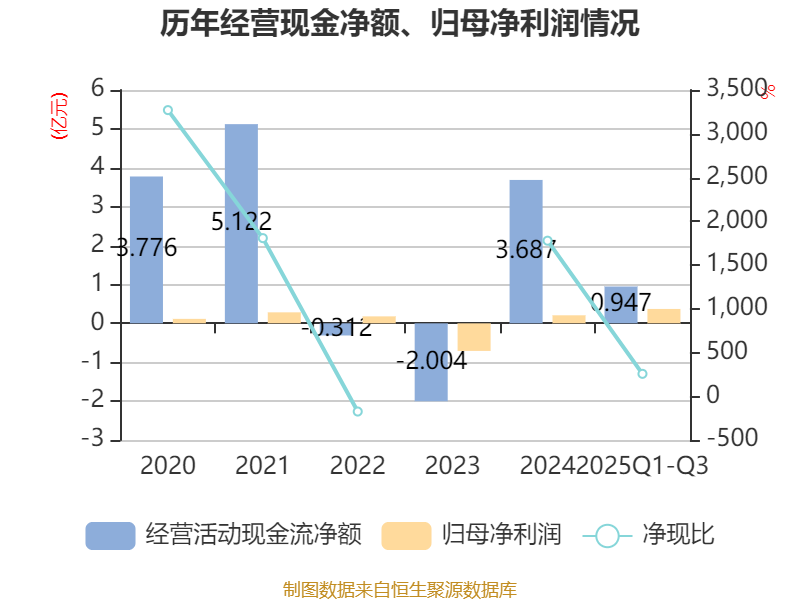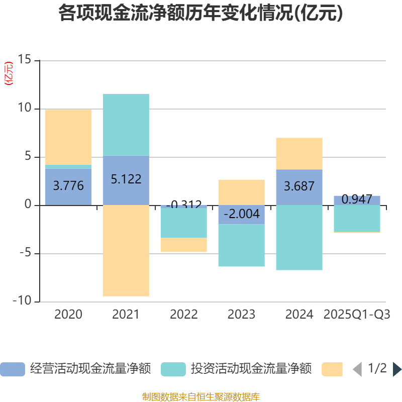 2025年前三季度,公司经营活动现金流净额为9467.4万元,同比下降40.02%;筹资活动现金流净额-722.85万元,同比减少3.85亿元;投资活动现金流净额-2.8亿元,上年同期为-5.39亿元。