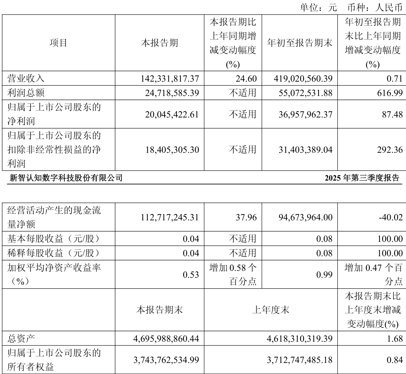 中证智能财讯 ST智知(603869)10月29日披露2025年第三季度报告。前三季度公司实现营业总收入4.19亿元,同比增长0.71%;归母净利润3695.8万元,同比增长87.48%;扣非净利润3140.34万元,同比增长292.36%;经营活动产生的现金流量净额为9467.4万元,同比下降40.02%;报告期内,ST智知基本每股收益为0.08元,加权平均净资产收益率为0.99%。