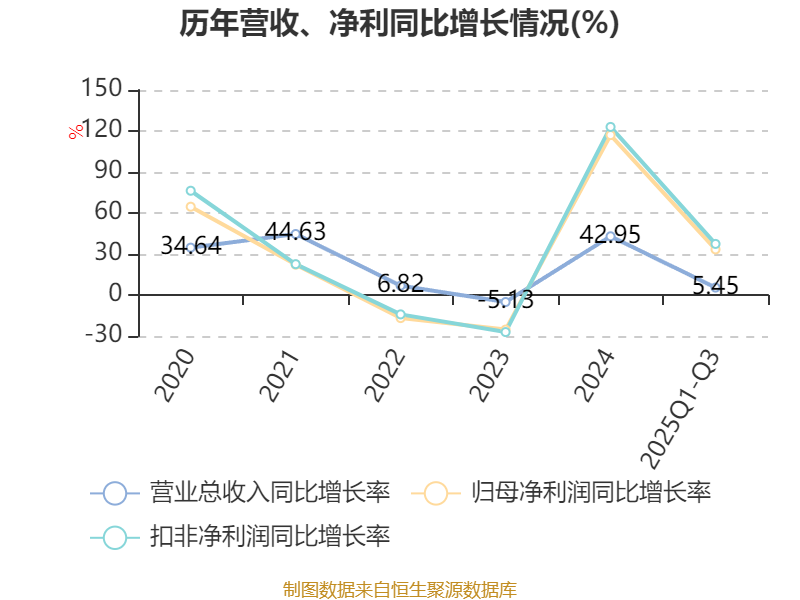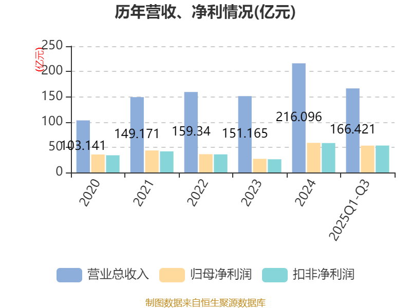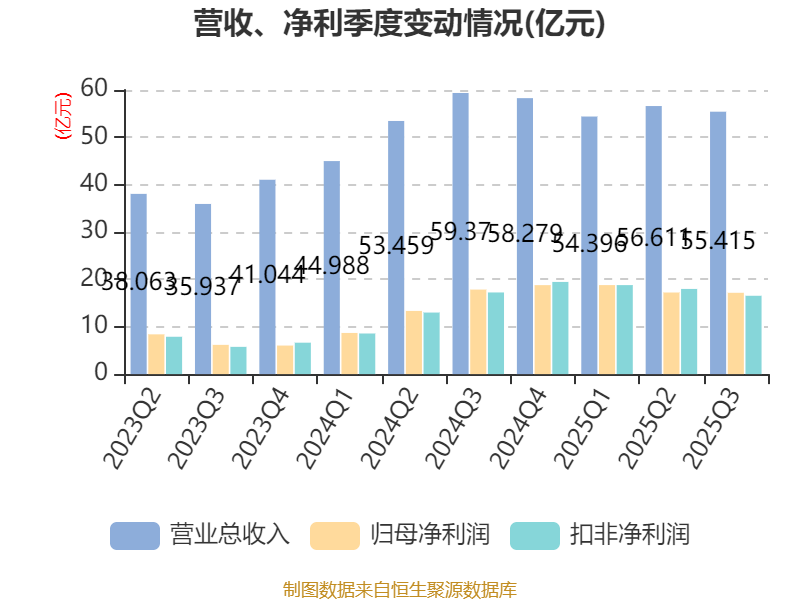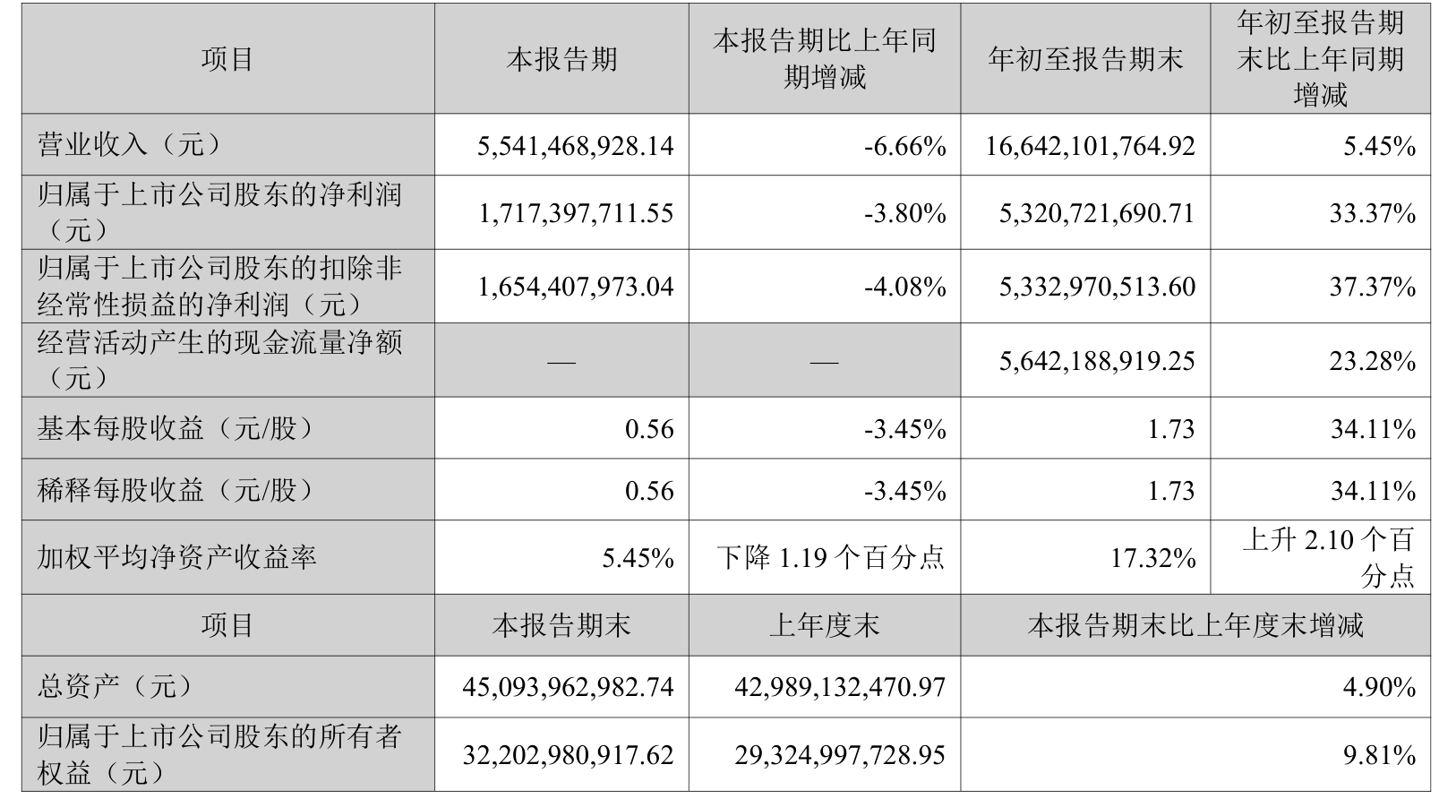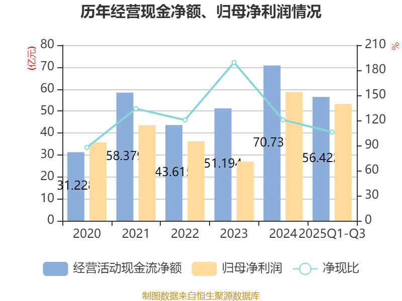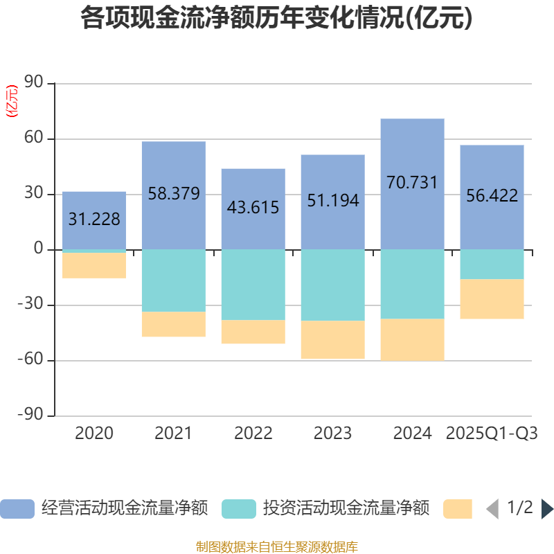 2025年前三季度,公司经营活动现金流净额为56.42亿元,同比增长23.28%;筹资活动现金流净额-21.43亿元,同比减少8.86亿元;投资活动现金流净额-16.27亿元,上年同期为-10.07亿元。