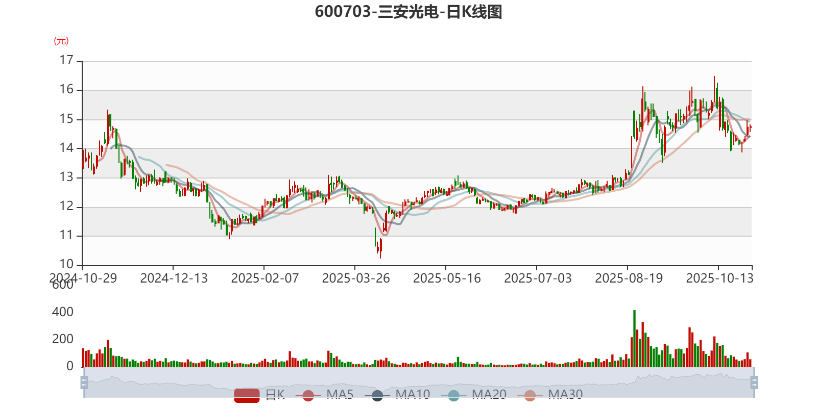 中证智能财讯三安光电(600703)10月29日披露2025年第三季度报告。前三季度公司实现营业总收入138.17亿元,同比增长16.55%;归母净利润8860.1万元,同比下降64.15%;扣非净利润亏损3.29亿元,上年同期亏损3.51亿元;经营活动产生的现金流量净额为16.6亿元,同比下降24.45%;报告期内,三安光电基本每股收益为0.02元,加权平均净资产收益率为0.24%。