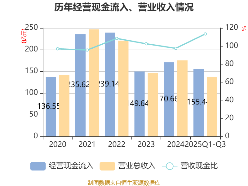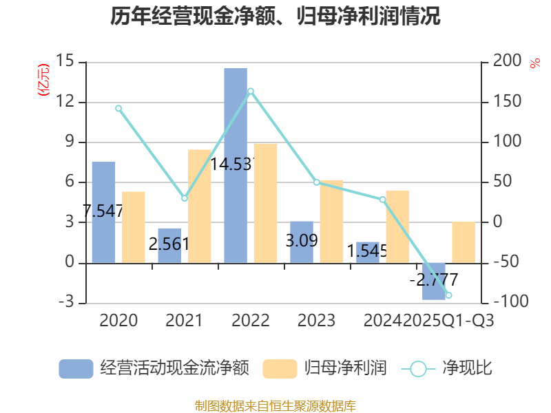 2025年前三季度,公司经营活动现金流净额为-2.78亿元,同比减少1.36亿元;筹资活动现金流净额8008.5万元,同比增加4.31亿元;投资活动现金流净额-9412.49万元,上年同期为-2755.89万元。