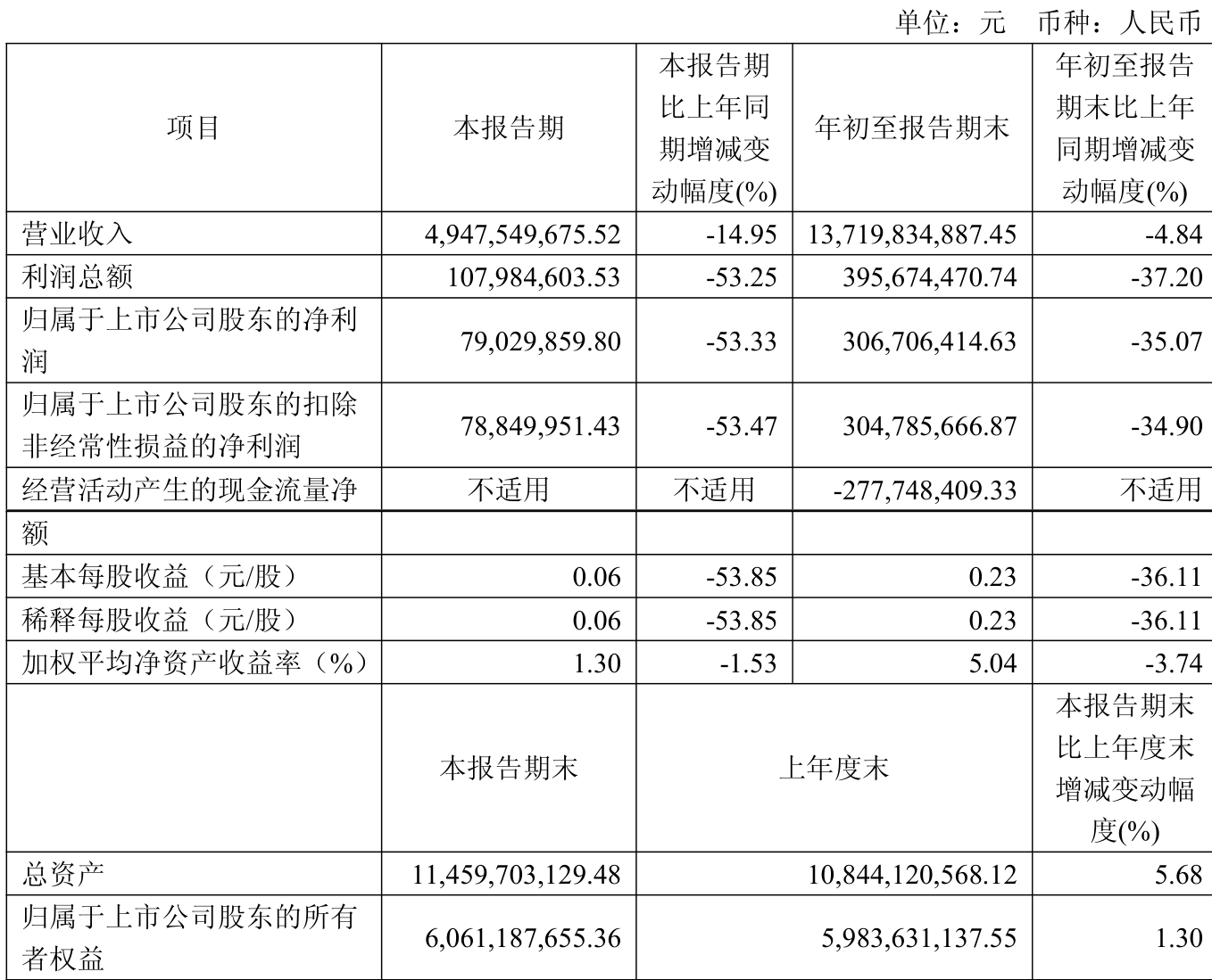 中证智能财讯华贸物流(603128)10月29日披露2025年第三季度报告。前三季度公司实现营业总收入137.2亿元,同比下降4.84%;归母净利润3.07亿元,同比下降35.07%;扣非净利润3.05亿元,同比下降34.90%;经营活动产生的现金流量净额为-2.78亿元,上年同期为-1.42亿元;报告期内,华贸物流基本每股收益为0.23元,加权平均净资产收益率为5.04%。