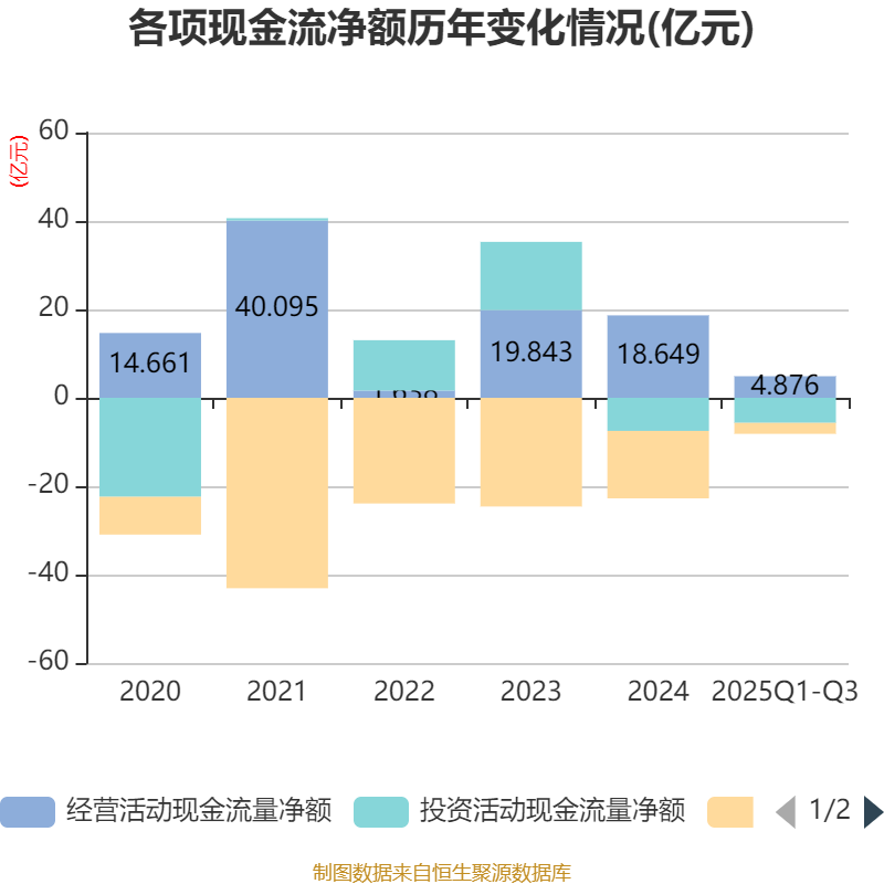 2025年前三季度,公司经营活动现金流净额为4.88亿元,同比下降59.7%;筹资活动现金流净额-2.48亿元,同比增加6.08亿元;投资活动现金流净额-5.67亿元,上年同期为-7.71亿元。