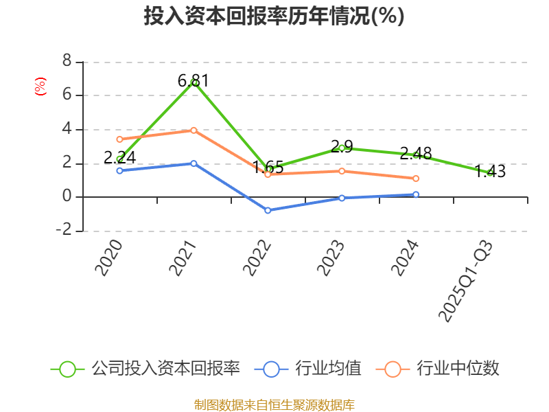 盈利能力方面, 2025年前三季度公司加权平均净资产收益率为1.61%,同比下降1.07个百分点。公司2025年前三季度投入资本回报率为1.43%,较上年同期下降0.88个百分点。