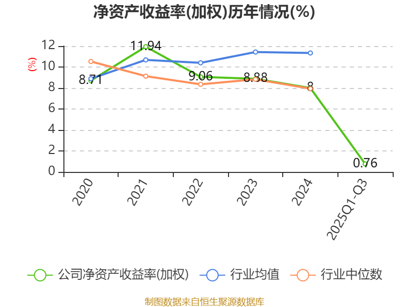盈利能力方面, 2025年前三季度公司加权平均净资产收益率为0.76%,同比下降4.44个百分点。公司2025年前三季度投入资本回报率为1.89%,较上年同期下降4.81个百分点。
