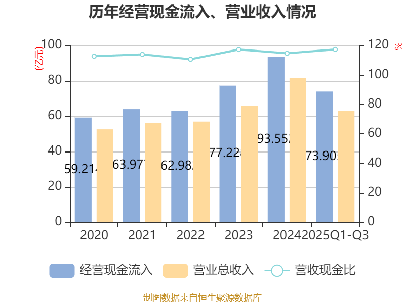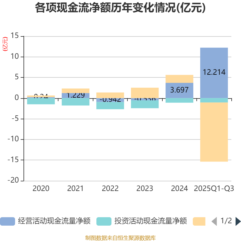 2025年前三季度,公司经营活动现金流净额为12.21亿元,同比增长29.74%;筹资活动现金流净额-14.32亿元,同比减少6.41亿元;投资活动现金流净额-1.06亿元,上年同期为-7121.25万元。