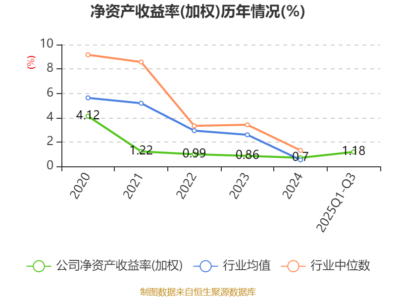 盈利能力方面, 2025年前三季度公司加权平均净资产收益率为1.18%,同比上升0.21个百分点。公司2025年前三季度投入资本回报率为1.26%,较上年同期下降0.65个百分点。