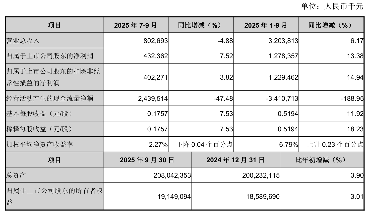 盈利能力方面, 2025年前三季度公司加权平均净资产收益率为6.79%,同比上升0.23个百分点。