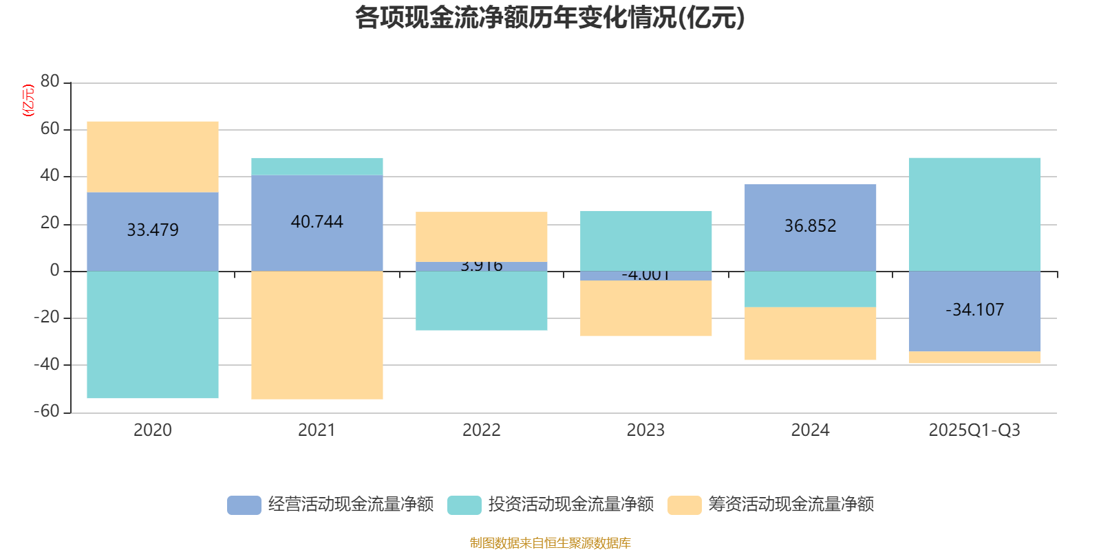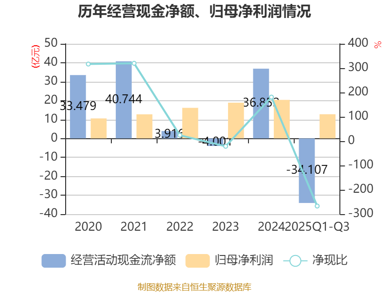 2025年前三季度,公司经营活动现金流净额为-34.11亿元,同比减少72.45亿元;筹资活动现金流净额-4.95亿元,同比增加16.79亿元;投资活动现金流净额48亿元,上年同期为-21.41亿元。