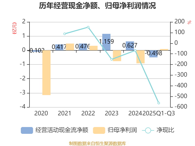 2025年前三季度,公司经营活动现金流净额为-4984.29万元,同比减少213.38万元;筹资活动现金流净额-662.92万元,同比增加7519.73万元;投资活动现金流净额-1.21亿元,上年同期为-768.79万元。