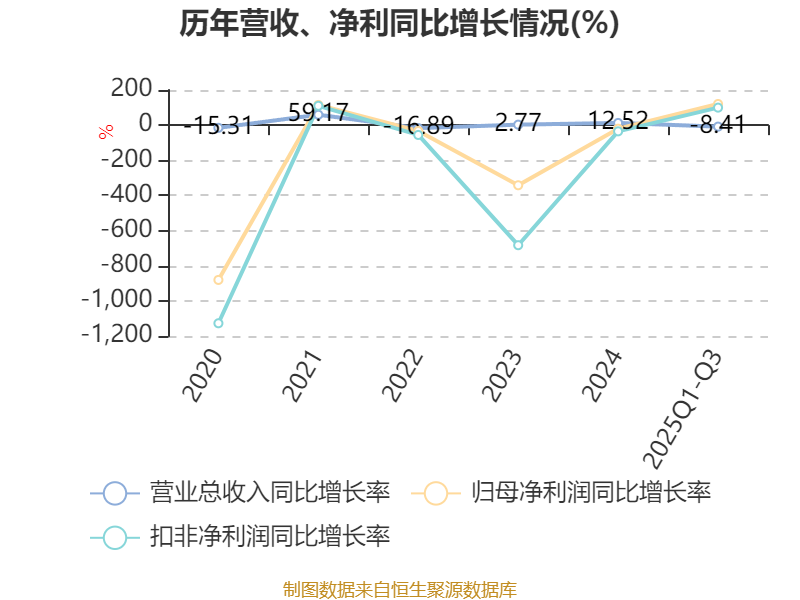 资产重大变化方面,截至2025年三季度末,公司货币资金较上年末减少42.39%,占公司总资产比重下降9.45个百分点;其他流动资产较上年末增加243.6%,占公司总资产比重上升3.62个百分点;交易性金融资产合计较上年末增加13.35%,占公司总资产比重上升3.14个百分点;应收票据及应收账款较上年末增加13.04%,占公司总资产比重上升3.08个百分点。