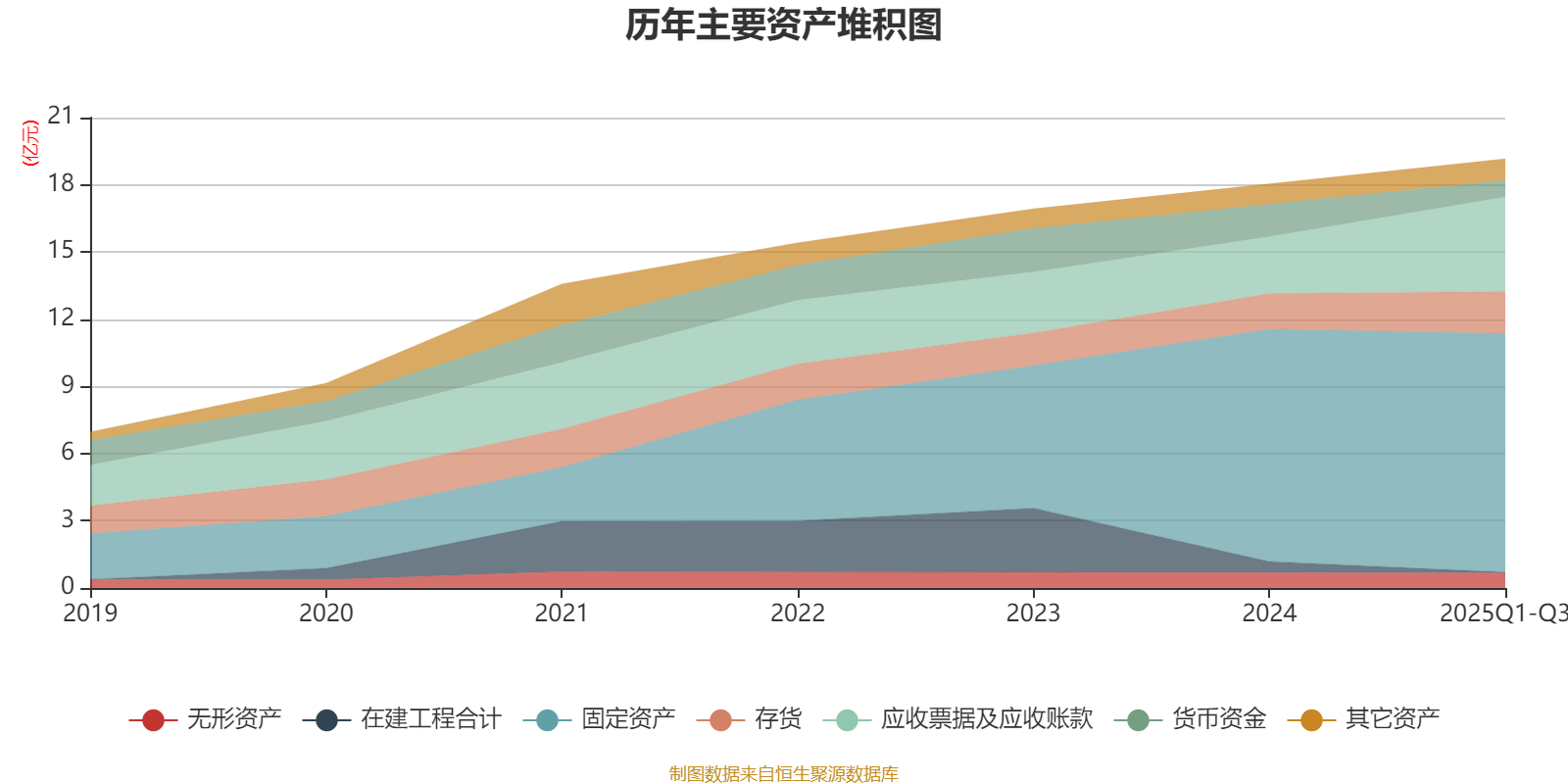 资产重大变化方面,截至2025年三季度末,公司应收票据及应收账款较上年末增加65.92%,占公司总资产比重上升7.93个百分点;货币资金较上年末减少48.12%,占公司总资产比重下降4.1个百分点;在建工程合计较上年末减少94.8%,占公司总资产比重下降2.59个百分点;固定资产较上年末增加2.69%,占公司总资产比重下降1.9个百分点。