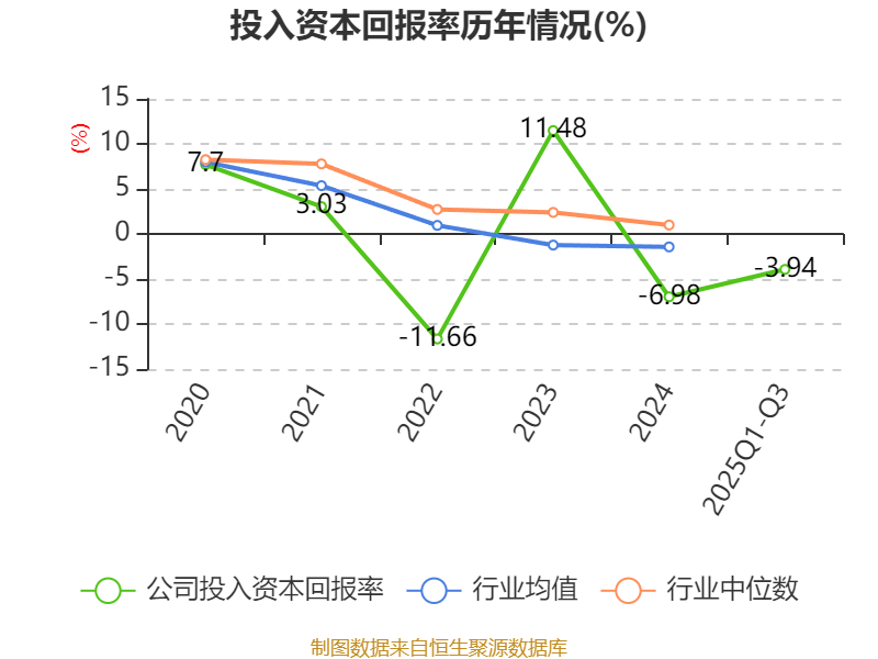 盈利能力方面, 2025年前三季度公司加权平均净资产收益率为-4.47%,同比上升1.01个百分点。公司2025年前三季度投入资本回报率为-3.94%,较上年同期上升1.56个百分点。